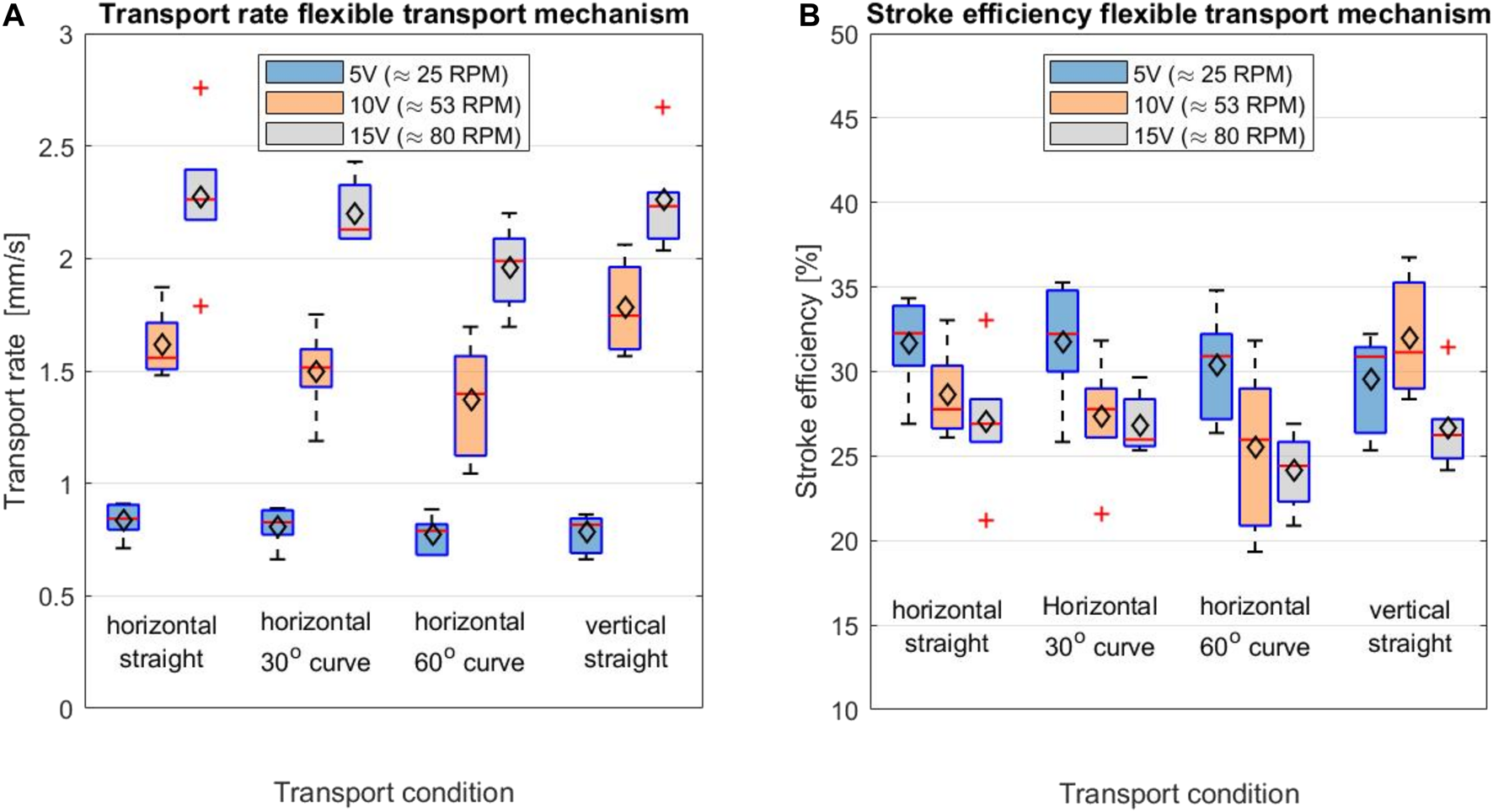 Boxplot displaying (A) the transport rate [mm/s] and (B) the stroke efficiency [%] for different test conditions; the shaft in horizontal orientation while being straight, in 30° and 60° curved position and with the shaft in vertical orientation. The maximum and minimum values are indicated by the outermost horizontal solid lines on each of the boxplots. The median is indicated by the horizontal red line in each boxplot, while the mean is indicated by the black diamond.