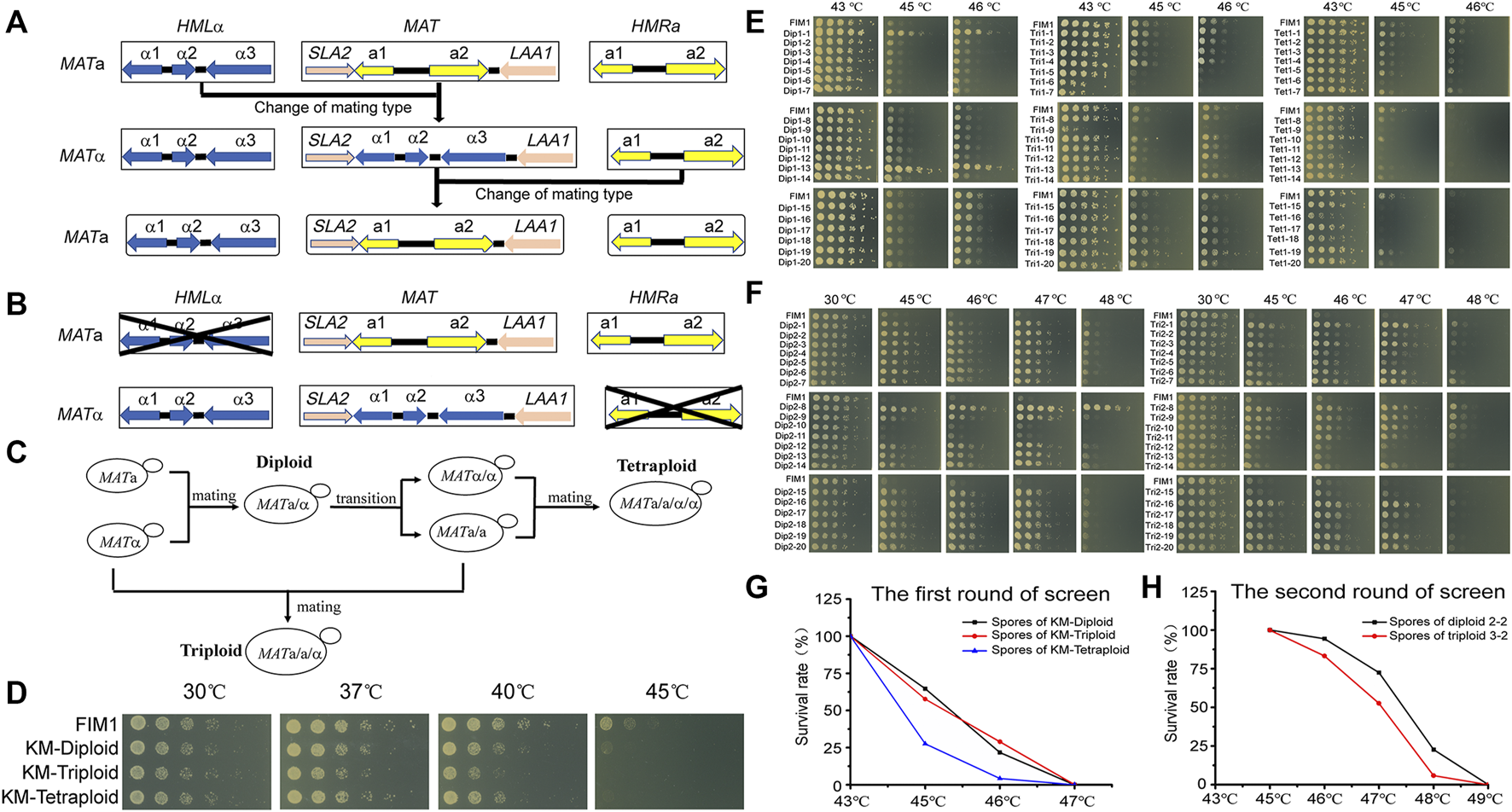The meiosis-based evolution of the thermotolerance in K. marxianus. (A) Switches of mating type in K. marxianus. (B) Constructions of stable MATa and MATα cells. (C) Constructions of diploid, triploid and tetraploid cells. (D) Spot assay of FIM1, KM-Diploid, KM-Triploid and KM-Tetraploid strains at different temperatures. (E) Spot assay of spores generated by KM-Diploid, KM-Triploid and KM-Tetraploid at different temperatures. (F) Spot assay of spores generated by 2–2 and 3–2 at different temperatures. (G, H) Survival rates of spores generated in the first (G) and second (H) rounds of the screen at different temperatures.