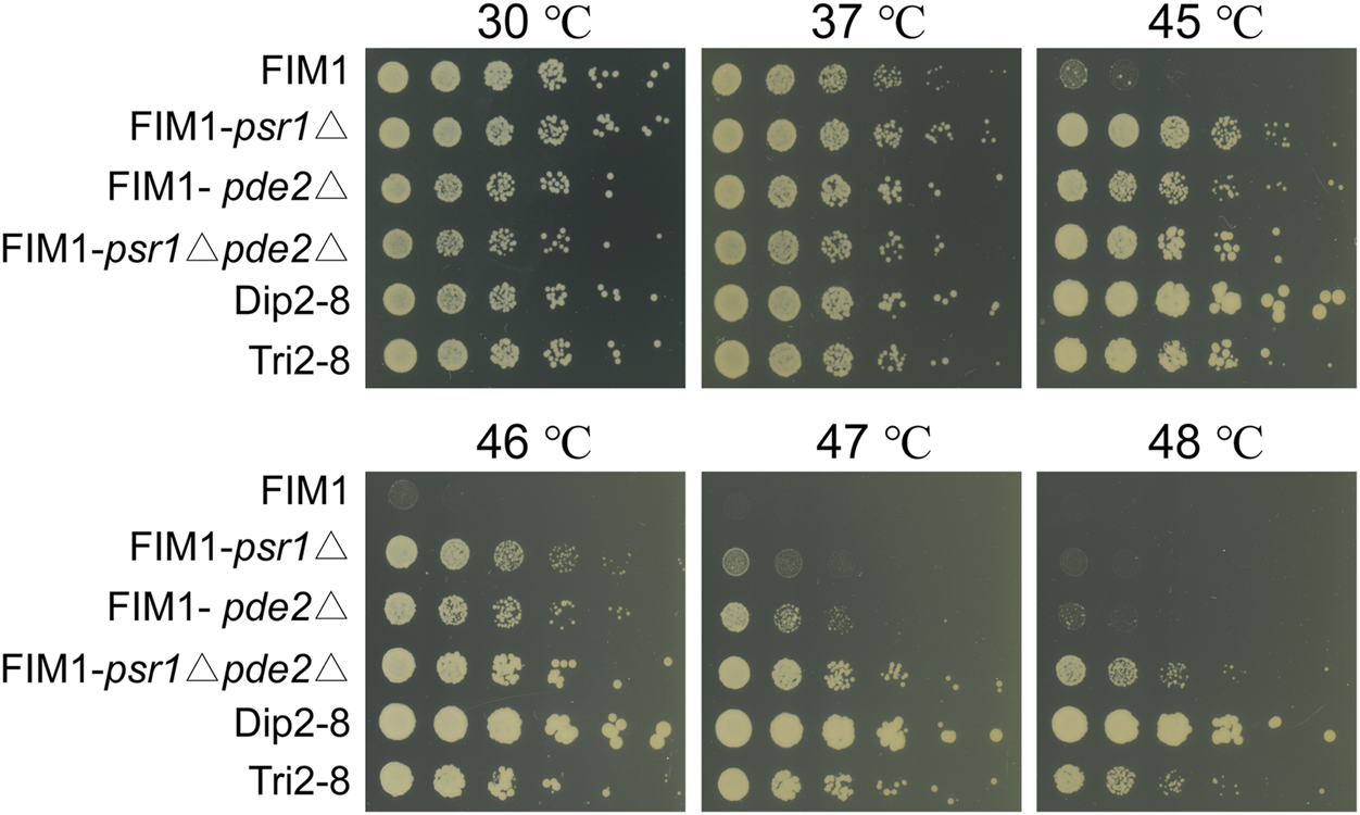For spot assays of FIM1, KM-Diploid, KM-Triploid, KM-tetraploid, FIM1-psr1Δ, FIM1-pde2Δ and FIM1-psr1Δpder2Δ, cells were grown in 3 ml YPD liquid medium at 30°C for 12 h. For the spot assay of spores, individual spore was grown in 3 ml YPD liquid medium and grown at 43°C or 46°C for 12 h. The culture was adjusted to an OD600 of 0.6 and then diluted fivefold five times. 3 μl dilutions were spotted on YPD plates. Plates were incubated at 30–48°C.