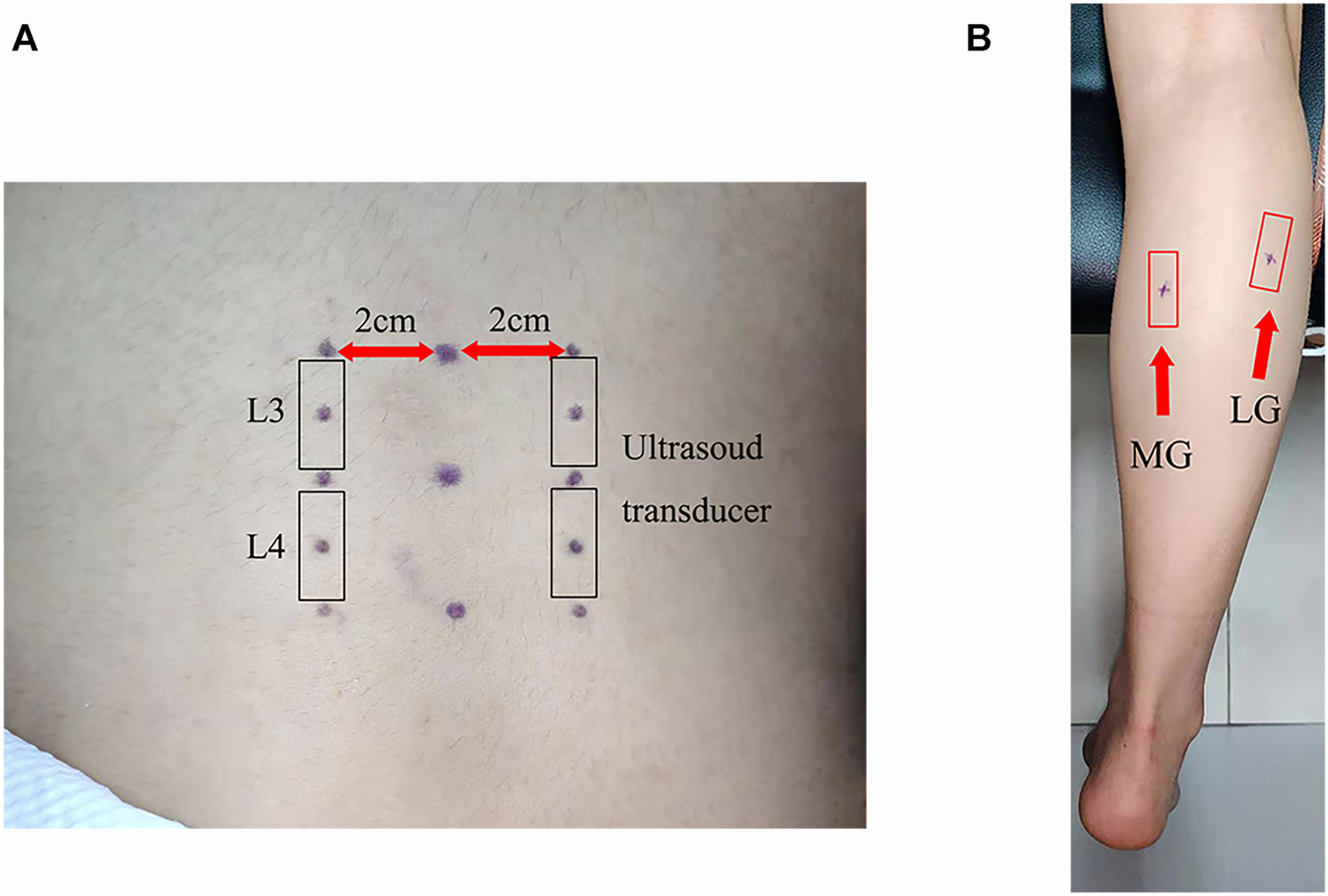 Setting out plan of the ultrasound transducer: (A) thoracolumbar fascia and erector spinae and (B) medial gastrocnemius and lateral gastrocnemius.