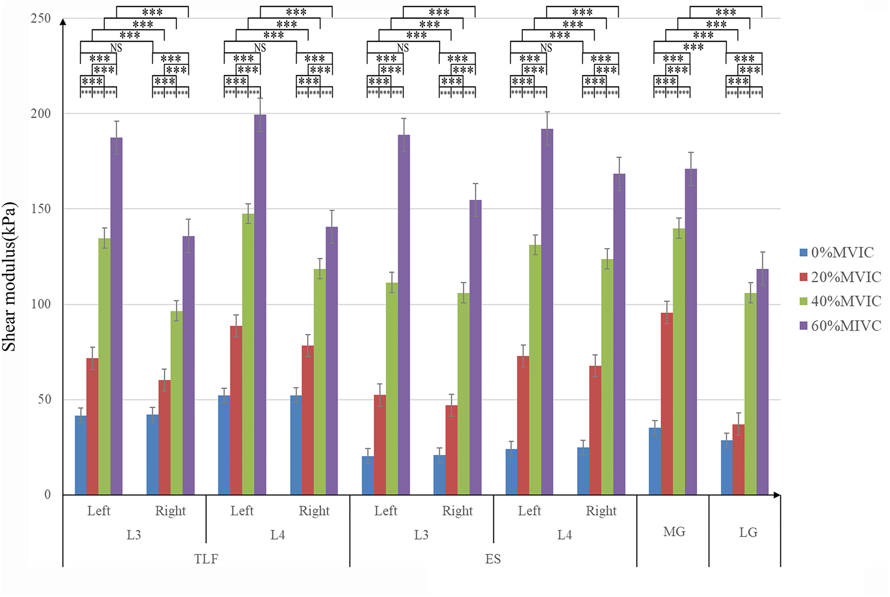 Results: There was a strong correlation between the stiffness change of MG and that of TLF (r = 0.768–0.943, p < 0.001) and ES (r = 0.743–0.930, p < 0.001), while it was moderate to strong correlation between MG and that of LG (r = 0.588–0.800, p < 0.001). There was no significant difference in the stiffness between the nondominant and dominant sides of TLF and ES under the resting position (p > 0.05). The increase in stiffness of the TLF, ES, MG, and LG, with MVIC percentage (p < 0.05), and the stiffness of TLF and ES on the nondominant side is much higher than that on the dominant side.