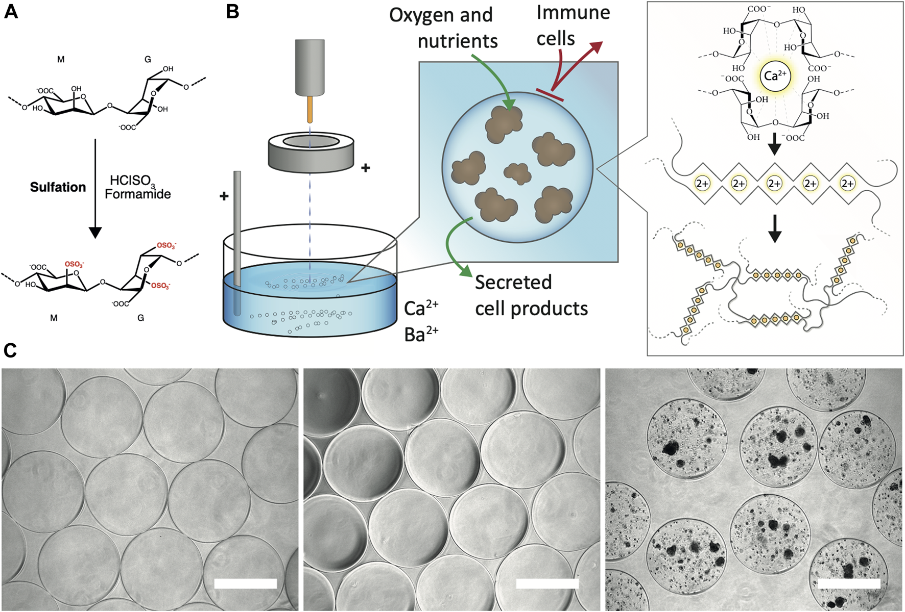 Generation of sulfated alginate and alginate microbeads. (A) Sulfation of the alginate by treatment with chlorosulfonic acid in formamide (B) Encapsulation of PSC-Hep spheroids. The spheroids in a homogenous mixture of calcium-free alginate solution are pumped out of the encapsulator nozzle. The electrostatic accelerator ring pulls the droplets downwards resulting in a smaller droplet diameter. Subsequently, the cell-alginate droplets are collected in bivalent cation (Ca2+ and Ba2+; shown as 2+)-containing solution which promotes crosslinking of predominantly the blocks of L-guluronic acid in the alginate, and generation of solid-phase alginate beads. The alginate matrix allows diffusion of oxygen, nutrients and secreted cell products, and provides a barrier against infiltration of immune cells. (C) Gross morphology of alginate microbeads by brightfield microscopy. Unmodified UP-LVG alginate microbeads (left), 40% sulfated alginate microbeads (middle) and hPSC-Heps spheroids encapsulated in 40% sulfated alginate (right) all showed regular morphology. Scale bars: 500 μm.