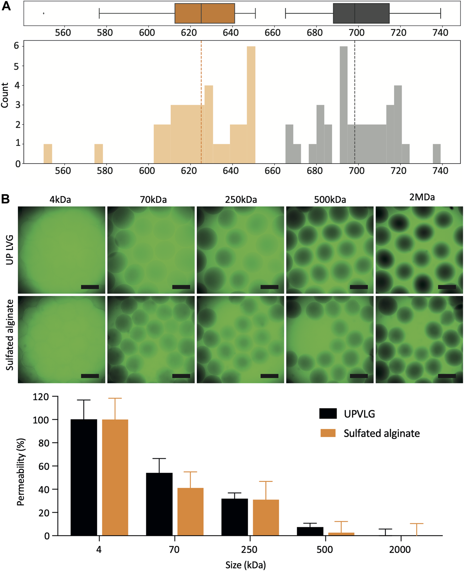 Sulfated alginate microbeads were on average smaller than UP-LVG alginate microbeads, with a mean diameter of 624 ± 22 μm and 699 ± 17 μm (mean ± SD), respectively (Figure 2A). The standard deviation of the microbead diameter describes the variability in microbead sizes and ideally should be kept as low as possible. Both alginates showed a comparable standard deviation of diameter, demonstrating that a reproducible encapsulation process across the batch can be maintained for both types of alginate.