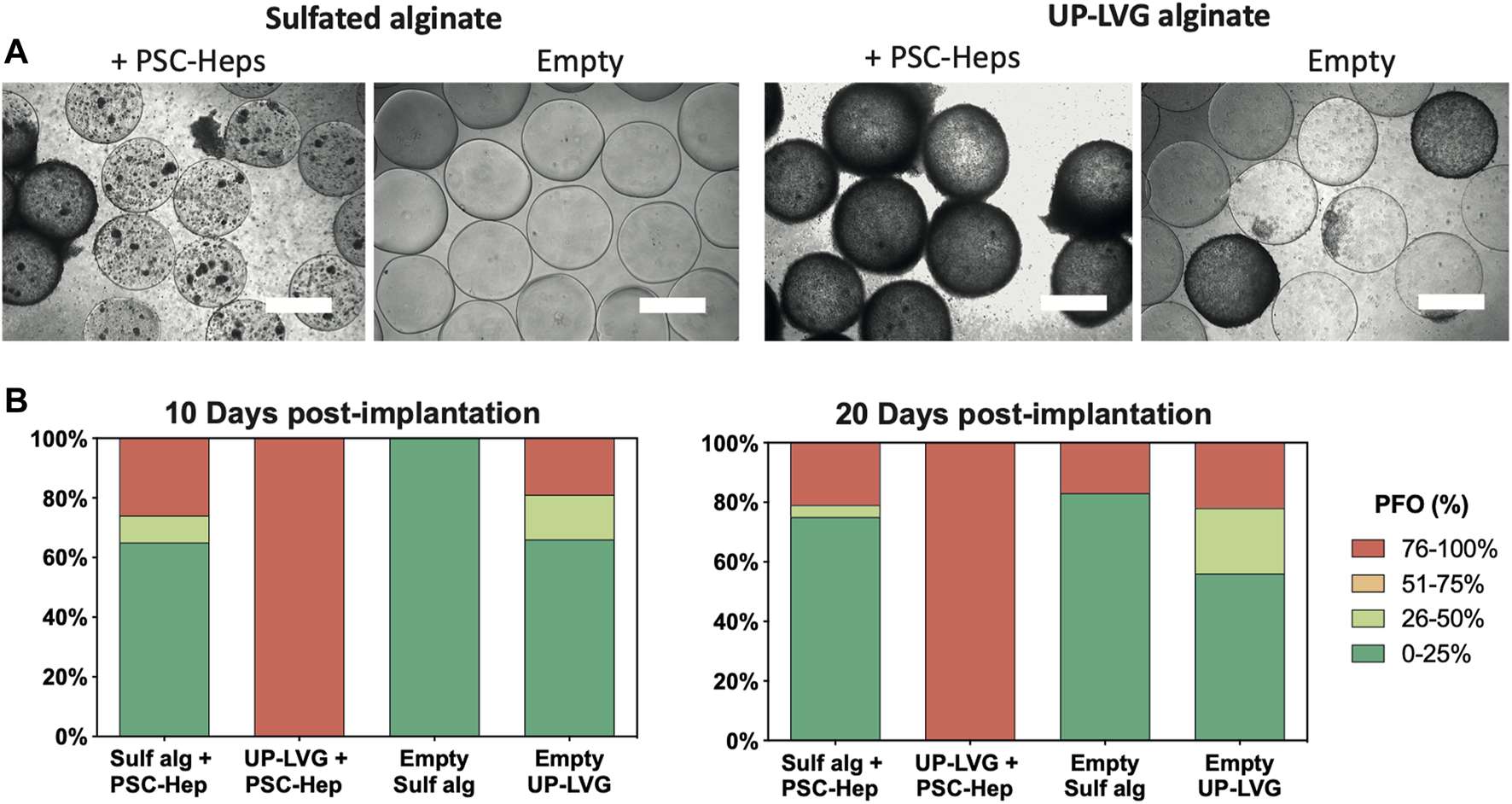 Ex vivo assessment of pericapsular fibrotic outgrowth on the non-modified and sulfated alginate microbeads. (A) Brightfield microscopy images of alginate microbeads retrieved from mice 10 days after intraperitoneal implantation. hPSC-Heps spheroids encapsulated in sulfated alginate show a lower degree of PFO compared to the spheroids encapsulated in non-modified alginate. Similarly, sulfated alginate empty microbeads show a lower degree of PFO than empty non-modified alginate. Scale bars: 500 μm (B) Stack bars showing the average degree of PFO for the alginate microbeads retrieved from the peritoneal cavity of mice at 10 days and 20 days post-implantation timepoints. Upon extraction on day 10 (left), hPSC-Heps encapsulated in sulfated alginate and empty sulfated alginate microbeads showed overall decreased PFO compared to hPSC-Hep-encapsulated and empty UP-LVG alginate microbeads (n >= 26 beads retrieved per group); similar but more pronounced difference was observed on day 20 (right) (n >= 9 beads retrieved per group).