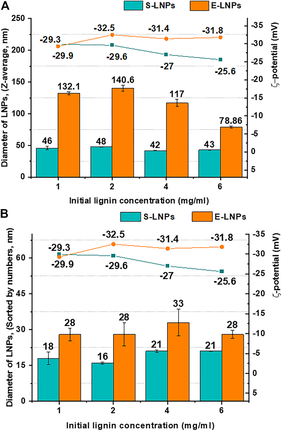 FIGURE 2. E-LNP size was larger than that of S-LNPs, and the size was not dependent on LNP concentration. Shown are (A) Z-average sizes (d, nm) and ζ-potential (mV) and (B) LNP sizes sorted by numbers (nm) and ζ-potential (mV) of the S- and E-LNPs obtained from the corresponding lignin fractions at the initial lignin concentrations between 1 and 6 mg/ml. Despite small variations of ζ-potential for S-LNPs, their surface charge was lower than that for E-LNPs.