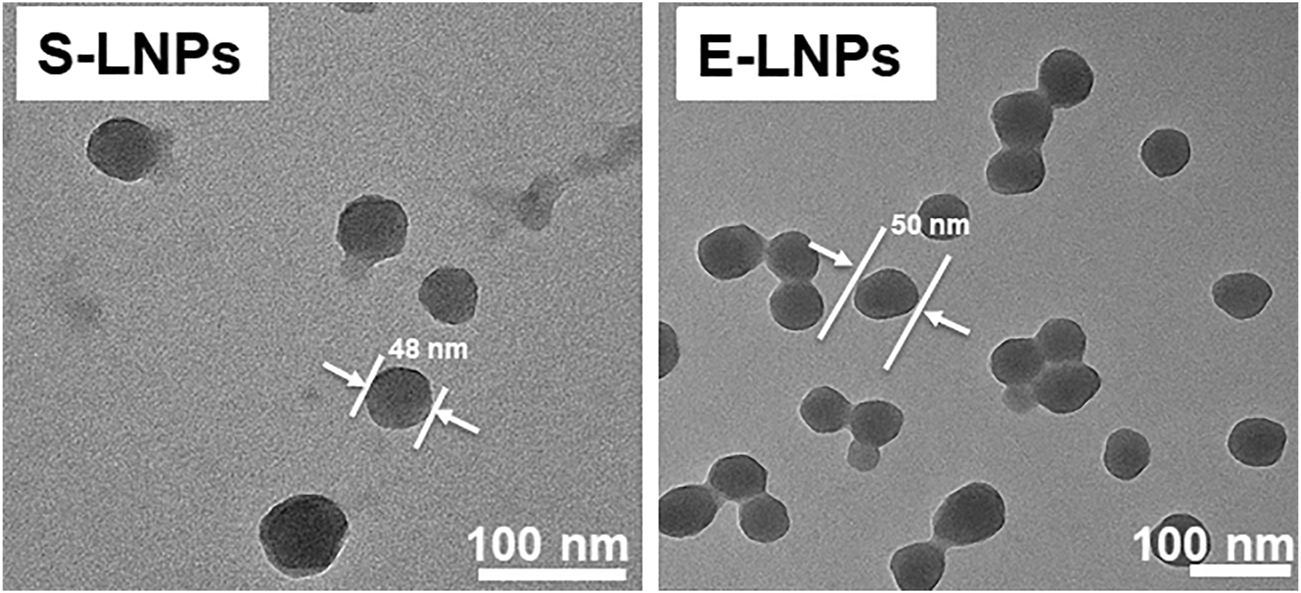 FIGURE 3. LNPs demonstrated a spherical form and a size of 48–60 nm as shown by TEM. The LNPs were synthesized at an initial lignin concentration of 1 mg/ml. Shown are TEM results for S- and E-LNPs.