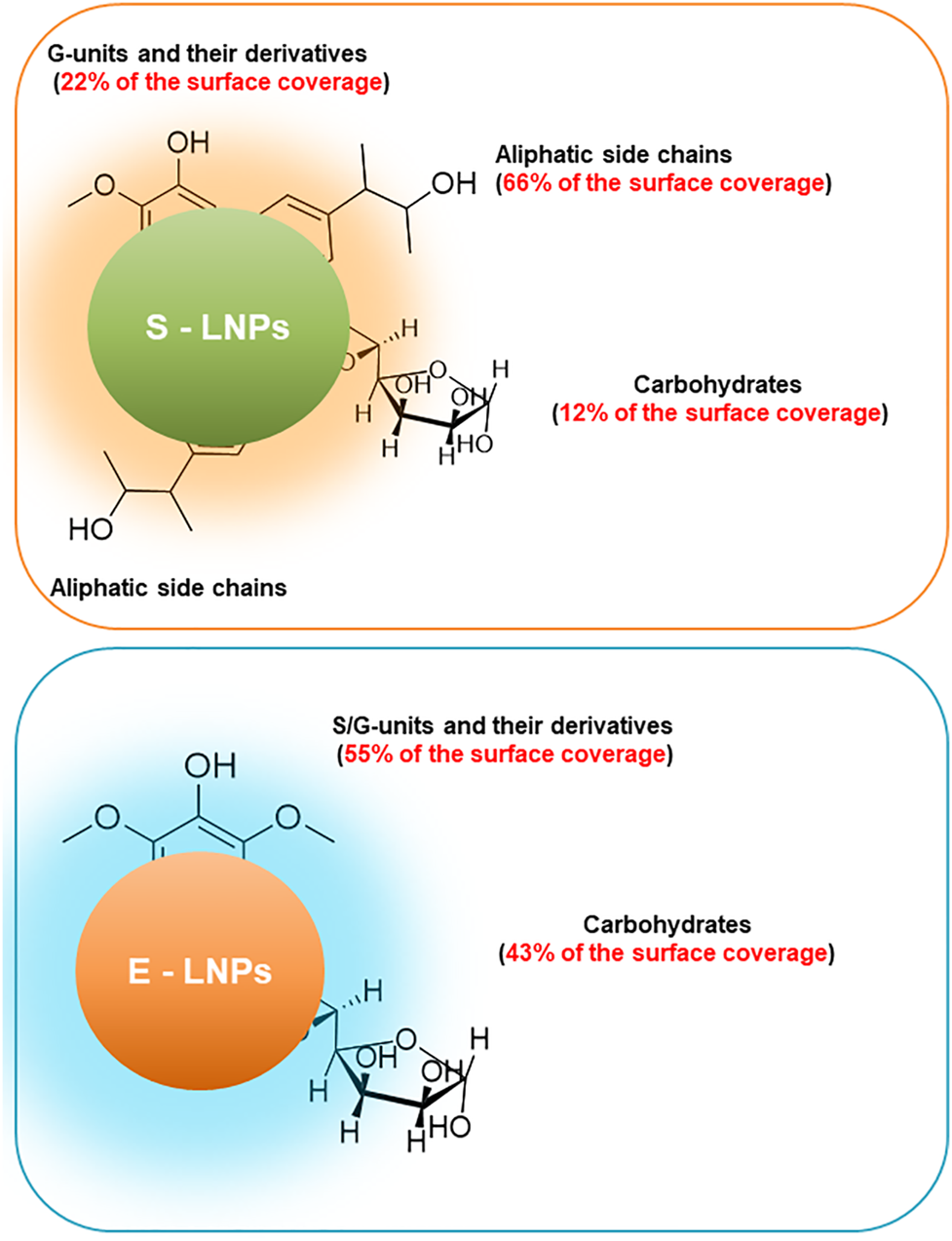 FIGURE 5. Surface of E-LNPs is covered mostly by S/G-units and carbohydrates, whereas surface of S-LNPs has three times lower carbohydrate content and G-units but is rich in aliphatic side chains. Schematic representation of the surface composition of LNPs from high-Mw lignin fractions. The ratio between aliphatic- and G-units was shown higher for S-LNPs, while the surface of E-LNPs contained an almost 1:1 ratio between carbohydrates and S/G aromatic units and was almost free of aliphatic side units of lignin.