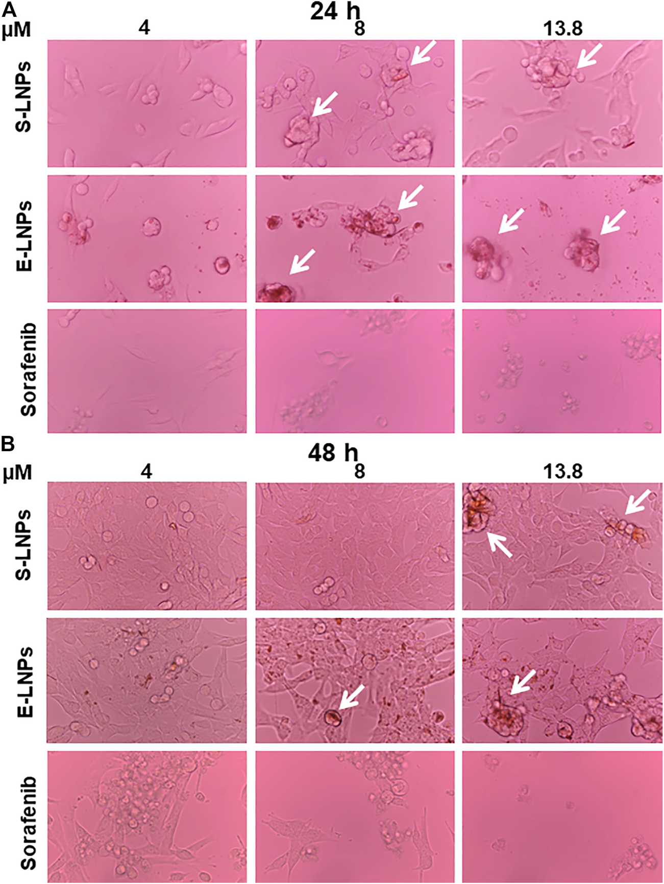 FIGURE 7. Microscopy showed a dose-dependent inhibition of HCC cells and accumulation of yellowish conglomerates in LNP-treated groups. HCC cells were treated with S-LNPs, E-LNPs, and standard therapy sorafenib. Bright-field microscopy (magnification ×40) was performed (A) 24 h and (B) 48 h post-incubation. Yellowish conglomerates are depicted with the white arrows. Details on all control groups are shown in Supplementary Figure S10.