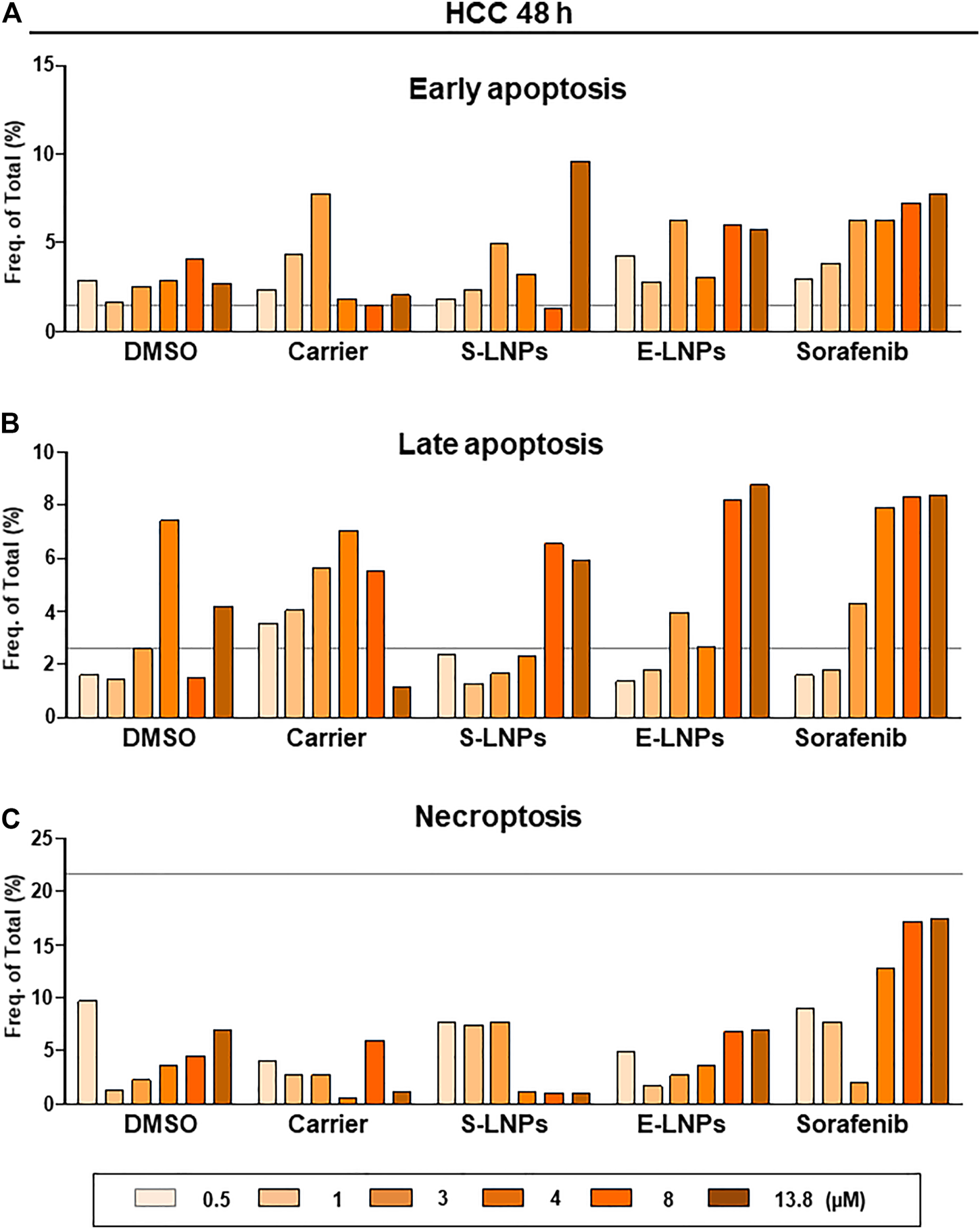 We further investigated the mechanism underlying the inhibition of the HCC cell line by the LNPs. To define the mechanism, we performed FACS analysis aiming to detect early and late apoptosis, as well as necroptosis (gating strategy is shown in Supplementary Figures S1, S2). After 48 h of incubation (Figures 8A–C), we observed a dose-dependent early apoptosis development in the sorafenib-treated group (Figure 8A). S- and E-LNP-treated cells showed varying numbers or early apoptosis, which were still higher than in the carrier-treated group (Figure 8A). However, late apoptosis was clearly shown upregulated in all three treatment groups. In particular, all high doses of S-LNPs and E-LNPs resulted in induction of late apoptosis (Figure 8B). Furthermore, the E-LNP-treated group showed the highest rate of late apoptosis, which was comparable to the sorafenib-treated group at concentrations 8 and 13.8 µM (Figure 8B). Interestingly, in E-LNP-treated cells we also detected elevated levels of necroptosis (a six times increase in comparison to the carrier at the 13.8-µM dose was observed), whereas the S-LNP-treated group did not show the presence of necroptosis at these treatment doses (Figure 8C). The sorafenib-treated group showed the highest necroptosis at 48 h of incubation (Figure 8C, 2.5 times increase detected at the 13.8-µM dose in comparison to DMSO as the carrier of sorafenib), and the result fully correlated with CVSA and microscopy, described above.