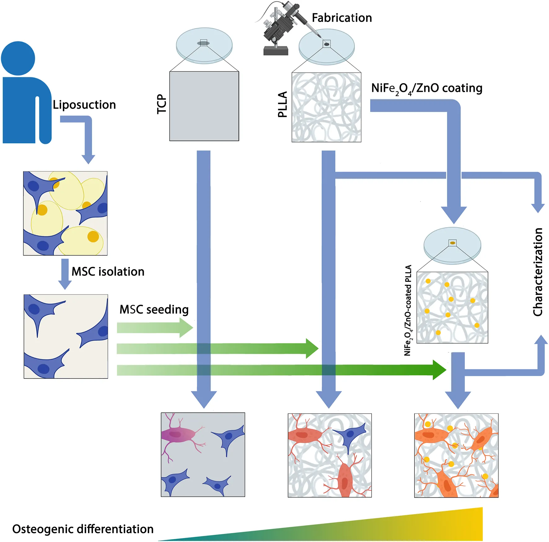 • In this study, a NiFe2O4/ZnO-coated PLLA scaffold was used to assess the osteogenic differentiation capability of human adipose tissue-derived Mesenchymal Stem Cells (hAMSCs) with the aim of bone tissue regeneration in vivo condition.