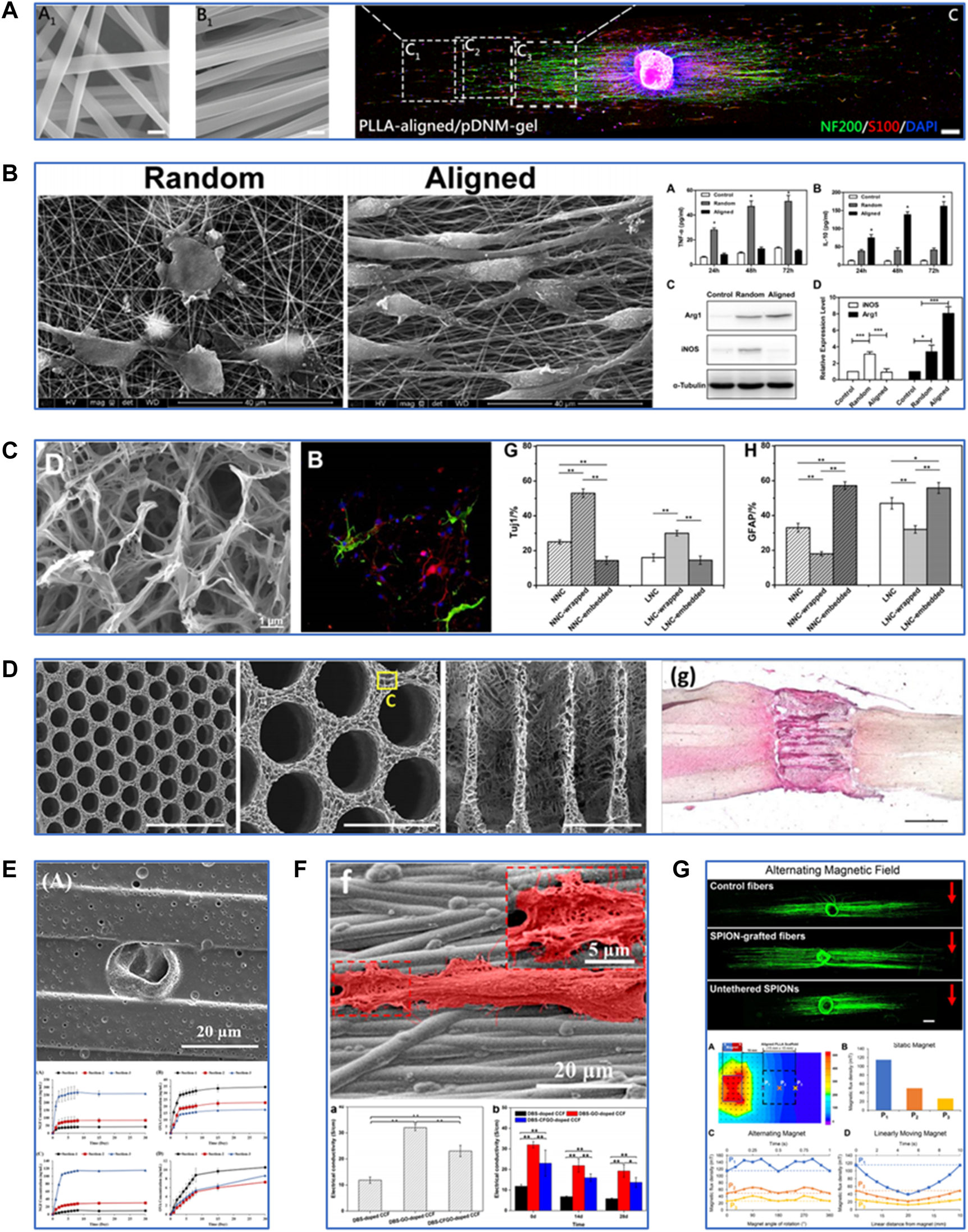 Fabrication and modification techniques of PLLA-based scaffolds for neural tissue engineering. (A) Characterization of PLLA-based scaffolds fabricated by electrospinning and their effects on neurite growth and Schwann cell migration. Reproduced with permission from Ref. (Chen S. et al., 2019). Copyright 2019, American Chemical Society. (B) Characterization of PLLA-based scaffolds fabricated by electrospinning and their effects on macrophage polarization. Reproduced with permission from Ref. (Jia et al., 2019). Copyright 2018, Elsevier. (C) Characterization of PLLA-based scaffolds fabricated by thermally induced phase separation and their effects on differentiation of neural stem cells into neurons. Reproduced with permission from Ref. (Liu et al., 2018). Copyright 2017, Elsevier. (D) Characterization of PLLA-based scaffolds fabricated by additive manufacturing and their effects on spinal cord regeneration. Reproduced with permission from Ref. (Kaplan et al., 2020). Copyright 2020, Elsevier. (E) Modification of PLLA-based scaffolds by drug delivery. Reproduced with permission from Ref. (Uz et al., 2017). Copyright 2016, Elsevier. (F) Modification of PLLA-based scaffolds by electrical stimulation. Reproduced with permission from Ref. (Shang et al., 2019). Copyright 2019, American Chemical Society. (G) Modification of PLLA-based scaffolds by magnetic stimulation. Reproduced with permission from Ref. (Funnell et al., 2021). Copyright 2021, Elsevier.