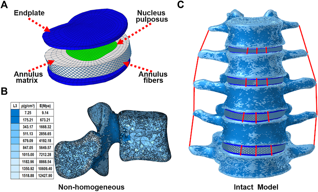 A three-dimensional nonlinear inhomogeneous FE model of L1-L5 was created based on computed tomography (CT) images of a healthy young male (Figure 1C). The CT images of a participant were obtained at intervals of 0.625 mm (Dual Source CT; Siemens, Munich, Germany). Mimics 21.0 (Materialise, Inc., Leuven, Belgium) was provided to reconstruct the geometric structure of the L1–L5. Initial smoothing and model repair with 3-Matic 13.0 (Materialise, Inc., Leuven, Belgium) and creation of discs, endplates, and facet joints (Figure 1A). These models were then imported into Hypermesh 16.0 (Altair Engineering, Troy, Michigan, United States) for meshing. The vertebral body was divided into a tetrahedral mesh. The intervertebral disc, endplates, and facet joints were divided into a hexahedral mesh. The thickness of the endplate is 0.8 mm, and the thickness of the facet joints is 0.2 mm (Kim et al., 2014). The vertebral body was assigned non-homogeneous values based on CT gray values in Mimics 21.0 software (Materialize, Leuven, Belgium) (Figure 1B) (Rho et al., 1995; Rana et al., 2020). Both the fluid-like behavior of the nucleus pulposus and the hyperelastic properties of the annulus matrix were modeled using the isotropic, incompressible, hyperelastic Mooney-Rivlin formulation (Schmidt et al., 2007). Annulus fibers consist of tension-only truss elements embedded into the annulus matrix, and the fiber stiffness gradually increases from inside to outside (Kim et al., 2014). The anterior longitudinal ligament, posterior longitudinal ligament, intertransverse ligament, ligamentum flavum, capsular ligament, interspinous ligament, and supraspinous ligament were modeled by using tension-only truss elements (Kim et al., 2014; Guo and Fan, 2018; Rana et al., 2020). The files of all models were imported into Abaqus (version 6.14; SIMULIA Inc.) in inp format. Facet joints were approximated by frictionless contact surfaces, and other contact surfaces are defined as Tie (Kim et al., 2014). Finally, nonlinear analysis is carried out in FEA software Abaqus (version 6.14; SIMULIA Inc.). Material properties of tissues of the lumbar spine model were extracted from the literature (Table1).