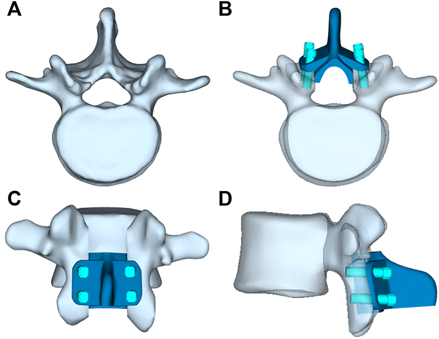 (A) L3 vertebrae, (B) Top view of artificil lamina, (C) Front view of artificil lamina,(D) Side view of artificil lamina.