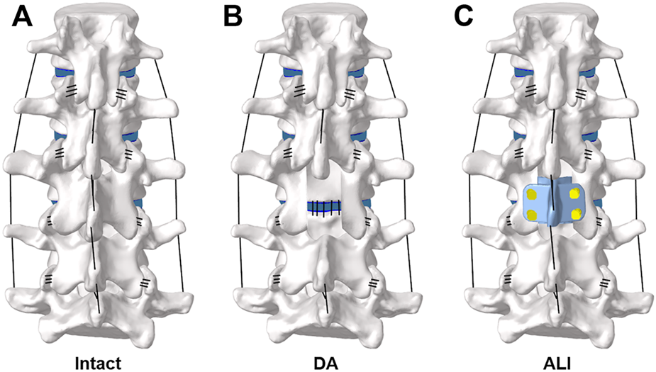 A total of two surgical approaches were simulated and contrasted in this study, namely the lumbar decompression alone surgical model (DA) (Figure 3B) and the artificial lamina implantation surgical model (ALI) (Figure 3C). For the DA surgical model, it was simulated by removing the medial portion of the L3 vertebral body, the supraspinous ligament, the interspinous ligament, and the ligamentum flavum, while preserving the facet joints on both sides. For the ALI surgical model, artificial lamina was implanted in the laminectomy area and the supraspinous ligaments and interspinous ligaments were reconstructed. The material properties of the above devices are shown in Table 1.