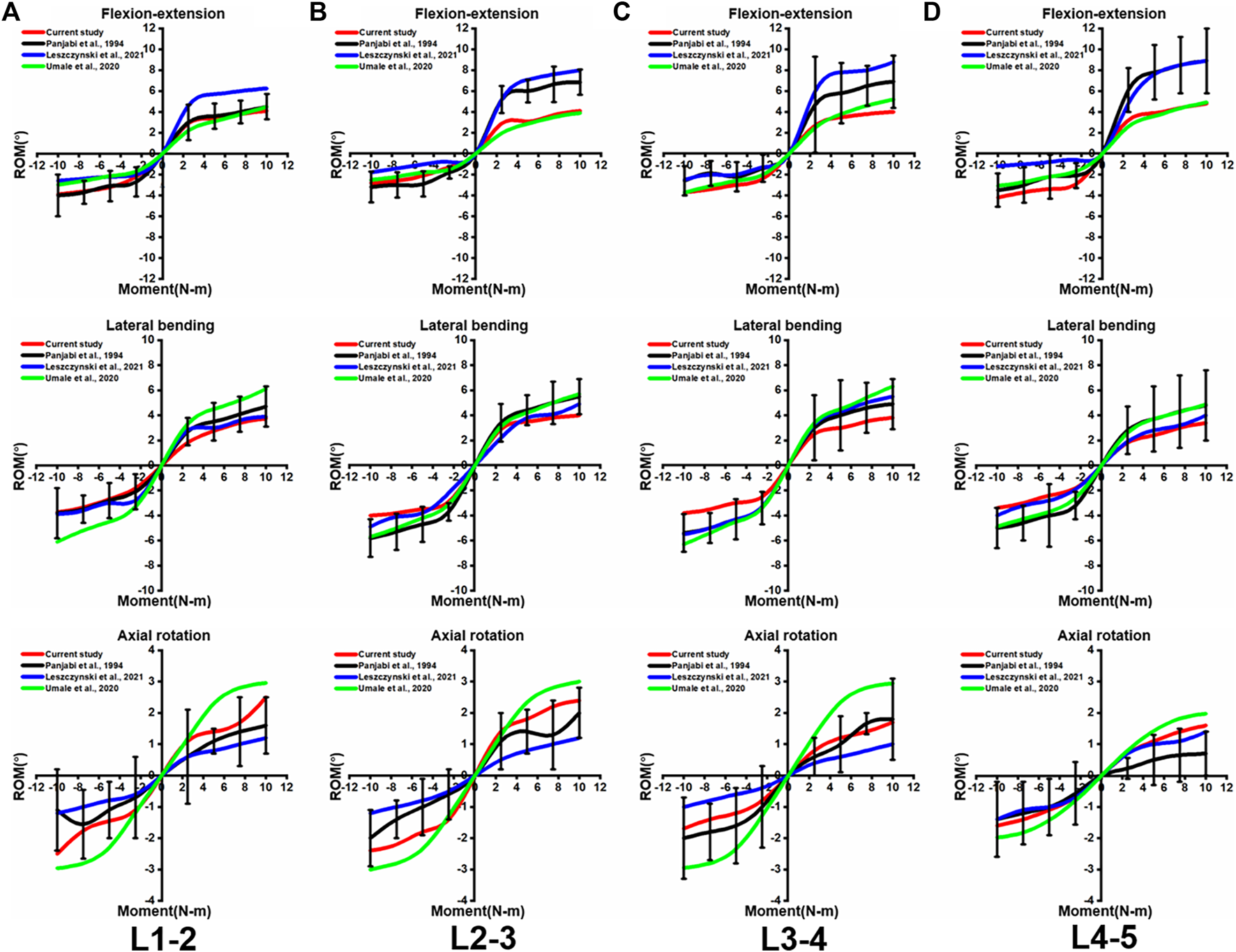 Comparison of the intersegmental ROM between the present intact model and the outcomes of previous publications under pure moments of 2.5N-m,5N-m,7.5n-m, and 10N-m conditions at (A) L1-2, (B) L2-3, (C) L3-4, and (D) L4-5. Error bars represent standard deviation.