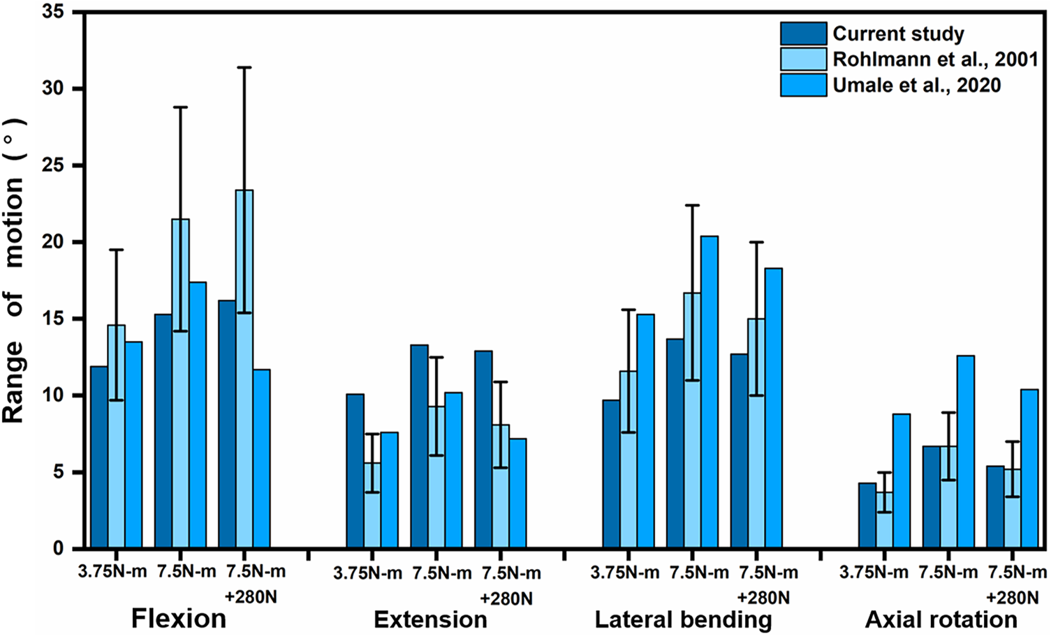 Comparison of L1-L5 total ROM between the present model and the results of previous publications under pure moments of 3.75N-m and 7.5N-m as well as 7.5N-m moments combined with 280N preload conditions at Flexion, extension, lateral bending, and axial rotation. Error bars represent standard deviation.