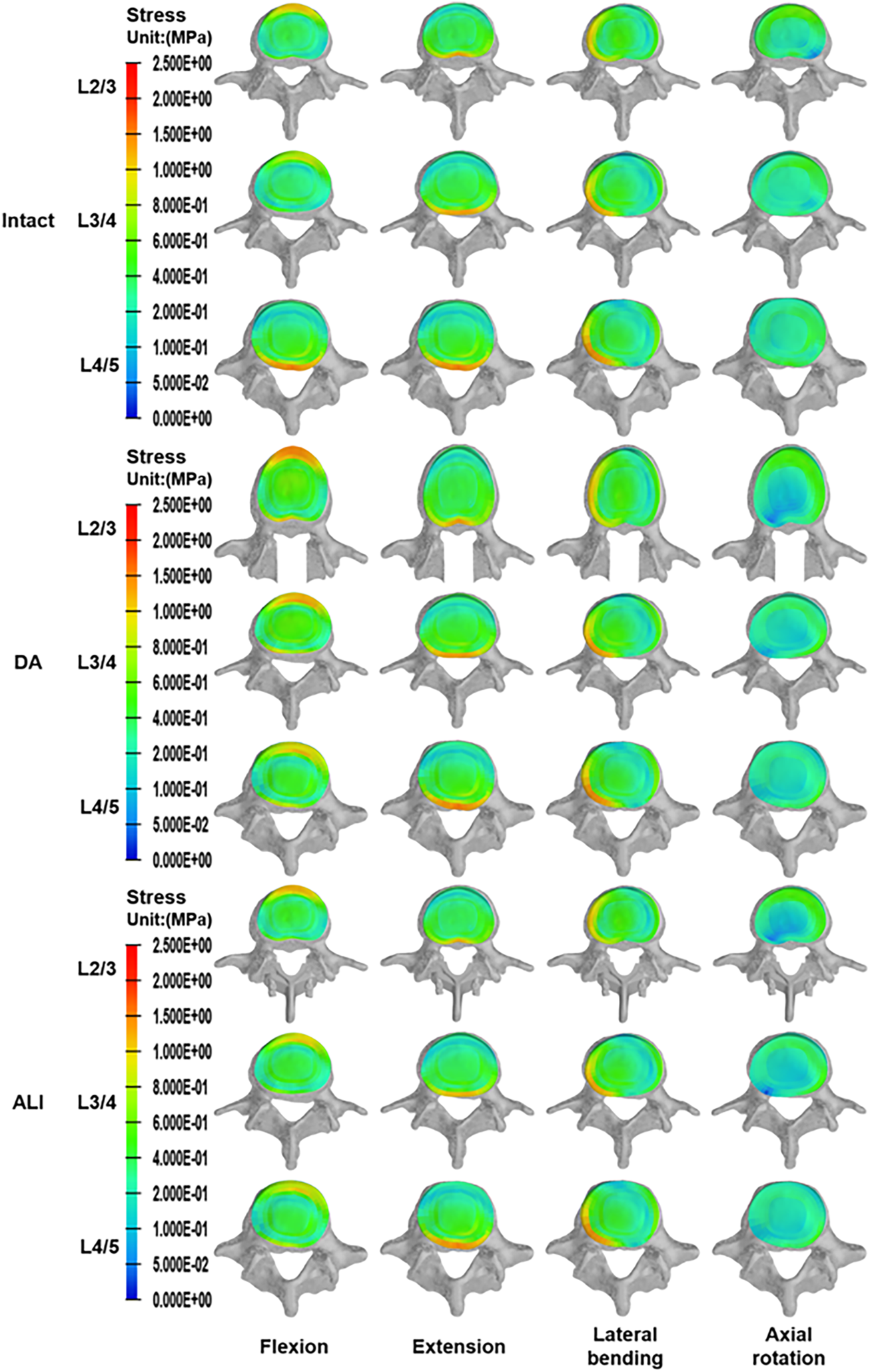 Compared to the intact model, the ALI model showed no apparent changes in IDP and annulus fibrosus peak stress in all motion conditions, with changes ranging from 0.2% to 11% and 0.1–10.2%, respectively.
