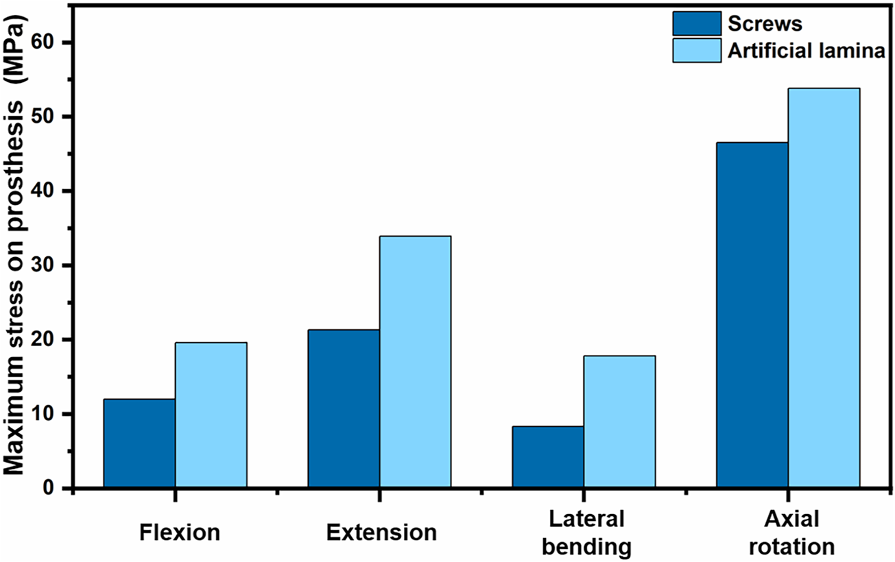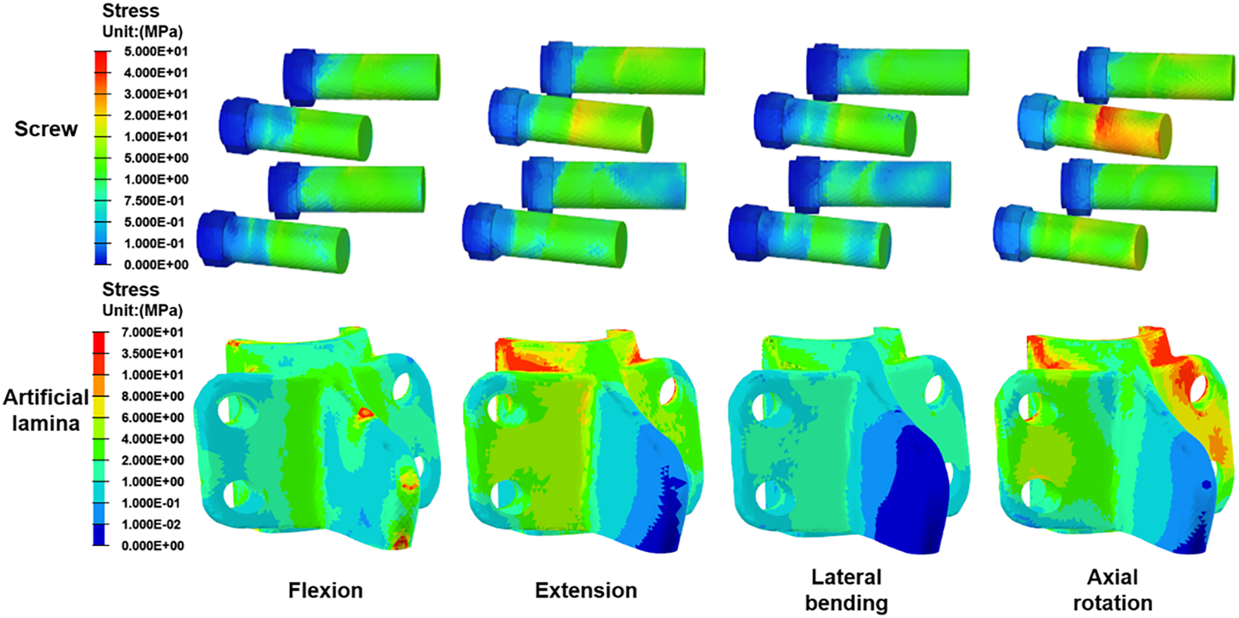 Figure 7 shows the stress peak for screws and artificial laminas under different conditions. The peak stresses of the screws were 12.0 MPa, 21.3 MPa, 8.3 MPa, and 46.53 MPa in flexion, extension, lateral bending, and axial rotation, respectively, while the peak stresses of the artificial lamina were 19.6 MPa, 33.9 MPa, 17.8 MPa, and 53.84 MPa, respectively. In addition, the stress distributions of the screws and artificial lamina are shown in Figure 8. Under different conditions, the stresses of the fixed screws are mainly concentrated at the connection between the screws and the artificial lamina. The stresses in the artificial lamina were mainly concentrated at the root of the spinous process, around the screw hole, and at contact with the vertebral body. Moreover, there was an obvious stress concentration under the spinous process during flexion due to the stretching effect of the ligaments.