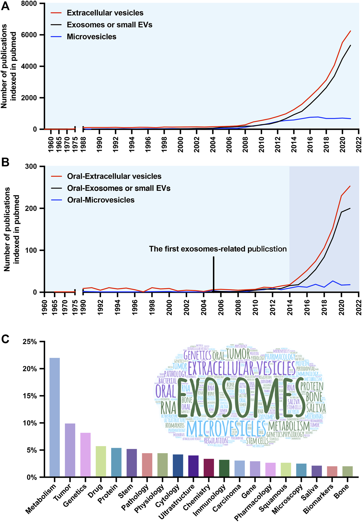 Number and keyword analysis of publications. (A) Timeline (1960–2021) of the publications referring to extracellular vesicles (EVs) (red line), exosomes or small EVs (black line), and microvesicles (blue line). (B) Timeline of the publications referring to oral-extracellular vesicles (red line), oral-exosomes or small EVs (black line), and oral-microvesicles (blue line). (C) The frequency distribution and cloud maps of keywords in the publications.