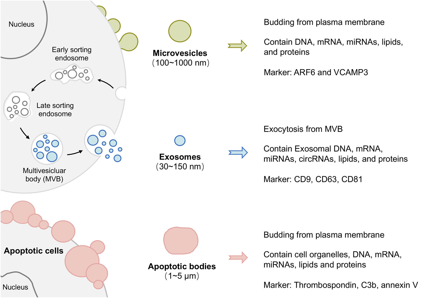 Although exosomes, microvesicles, and apoptotic bodies are all membrane trafficking vesicles, they have a totally different biogenesis pattern. As shown in Figure 2, Exosomes originate through endocytosis, which means that the plasma membrane invaginates from outside to inside to raise vesicles. As a result, exosomes contain extracellular materials and cellular membrane constituents (Hessvik and Llorente, 2018). MVs and apoptotic bodies, conversely, are generated via outward budding by pinching off from the plasma membrane surface (inside to outside). Therefore, MVs and apoptotic bodies are known collectively as ectosomes (Colombo, et al., 2014; Teng and Fussenegger, 2020).
