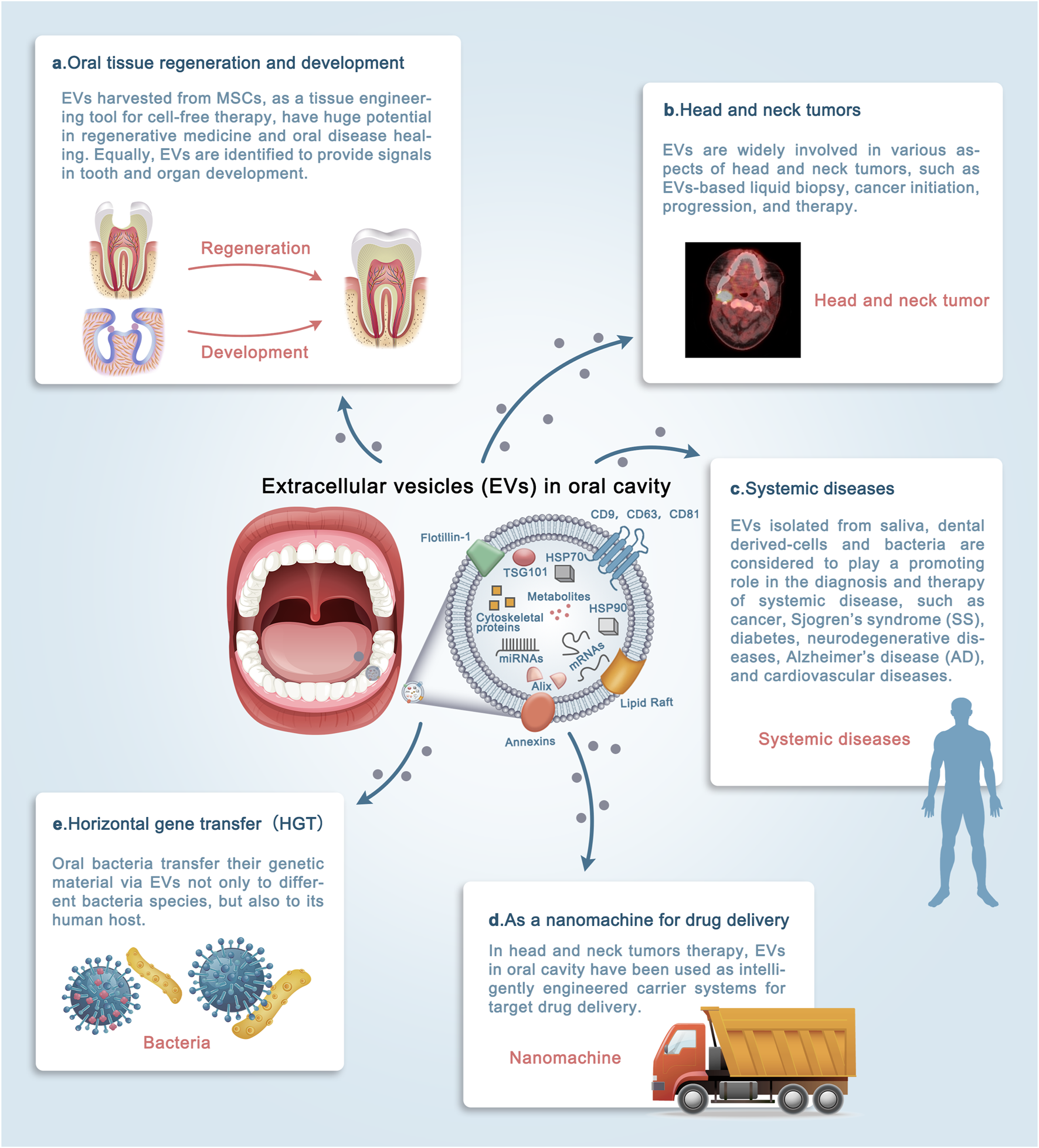 Growing evidence suggests that extracellular vesicles exert their function mainly via the targeted transfer of functional cargo to promote intercellular communication. Novel biological functions of EVs continue to be described, including cancer treatment, early diagnosis, tissue regeneration, and drug delivery (Huang, et al., 2019; Wiklander, et al., 2019; Kalluri and LeBleu, 2020). Research also shows that mesenchymal stem cell (MSC)-derived exosomes have no adverse effects on toxicological testing (Ha, et al., 2020a). Even xenogeneic extracullular vesicles have shown a therapeutic effect similar to that of allogeneic EVs in soft tissue repair (Dong, et al., 2020). These findings imply that the extracellular vesicles not only exhibit potential for clinical applications but are also relatively safe. Therefore, the objectives of this paper were to review current knowledge on both cell source and cell-independent source of EVs in oral cavity, highlight the research directions of biomedical application of EVs, and elucidate the mechanisms of extracellular vesicles-based horizontal gene transfer for the first time.