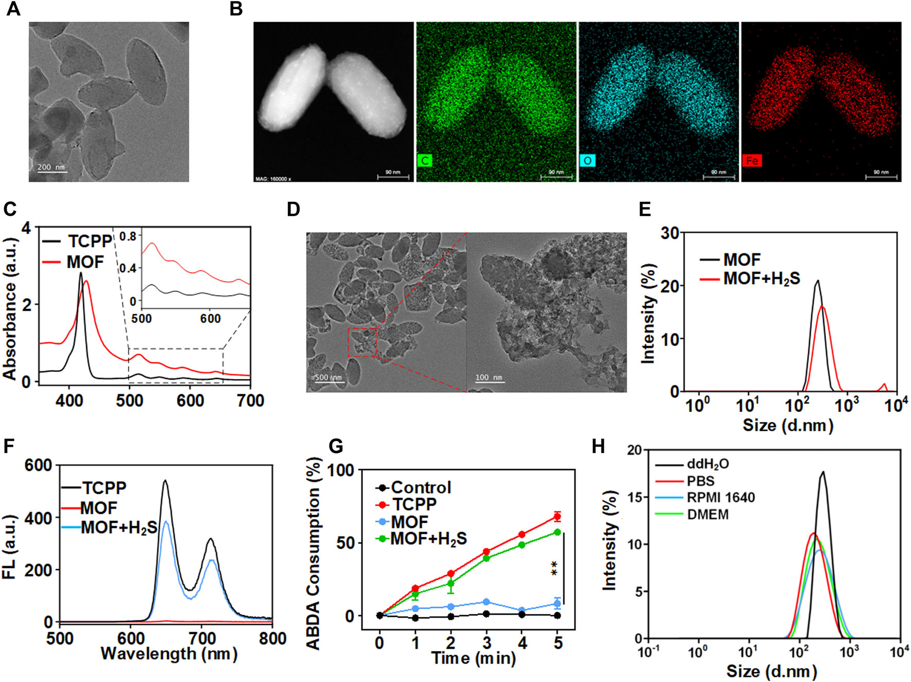 Characterization of MOF. (A) TEM image (scale bar: 200 nm). (B) Elemental mapping of MOF (scale bar: 50 nm). (C) UV−vis spectra of MOF and TCPP. (D) The TME of H2S-triggered bio-decomposition of MOF. (E) The hydrodynamic size of MOF with different conditions. (F) Fluorescence spectra of TCPP, MOF and MOF with NaHS. (G) Consumption rates of ABDA with different composites under 660 nm laser irradiation (50 mW cm−2) within 5 min (H) DLS measurement of MOF in different media.