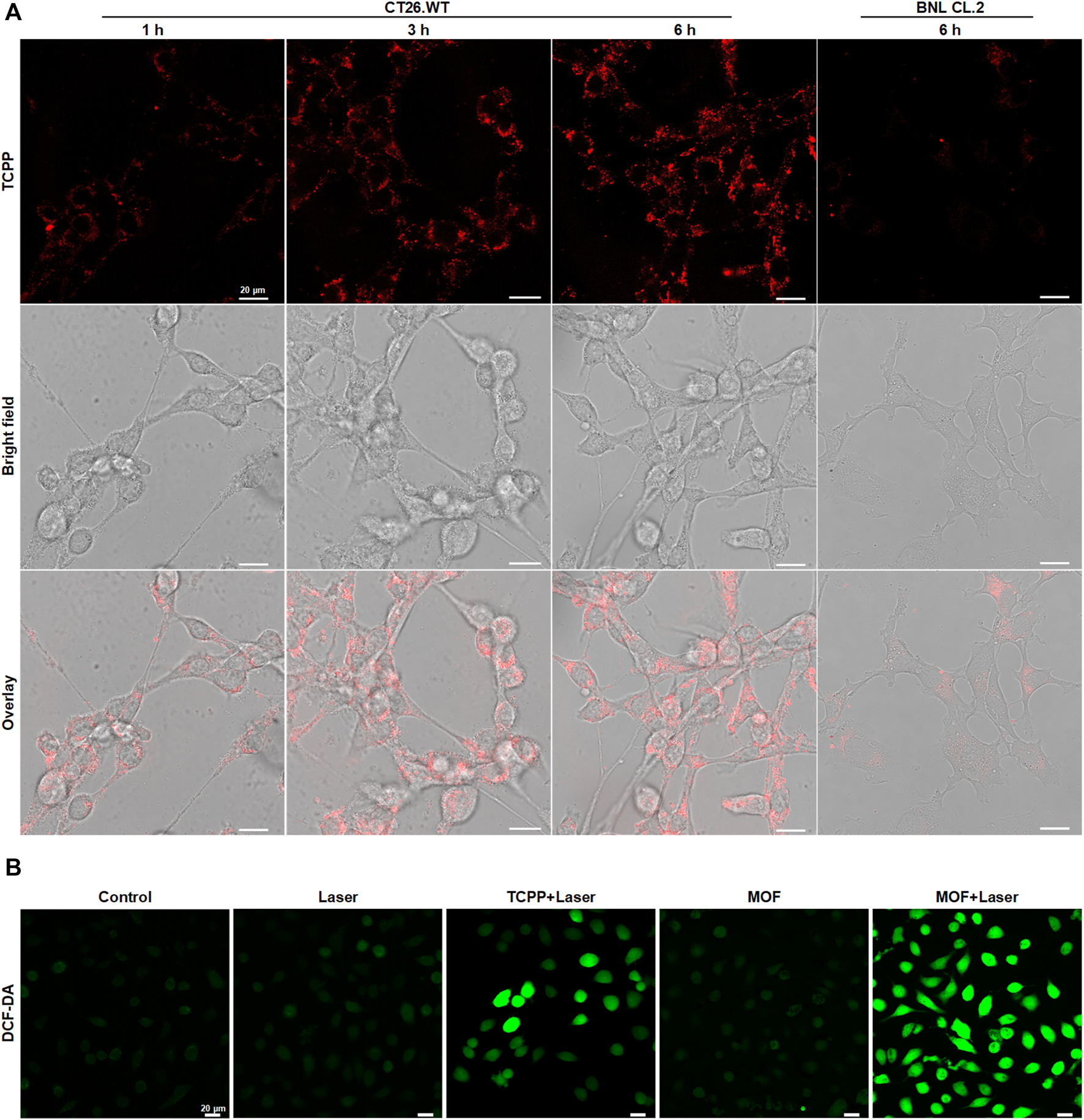 CT26. WT cells and BNL. CL2 were inoculated into confocal plates for 24 h, then incubated with MOF concentration of 50 μg ml−1 for 6 h. After being washed with PBS for three times, the cells were observed under CLSM (Ex: 405 nm).
