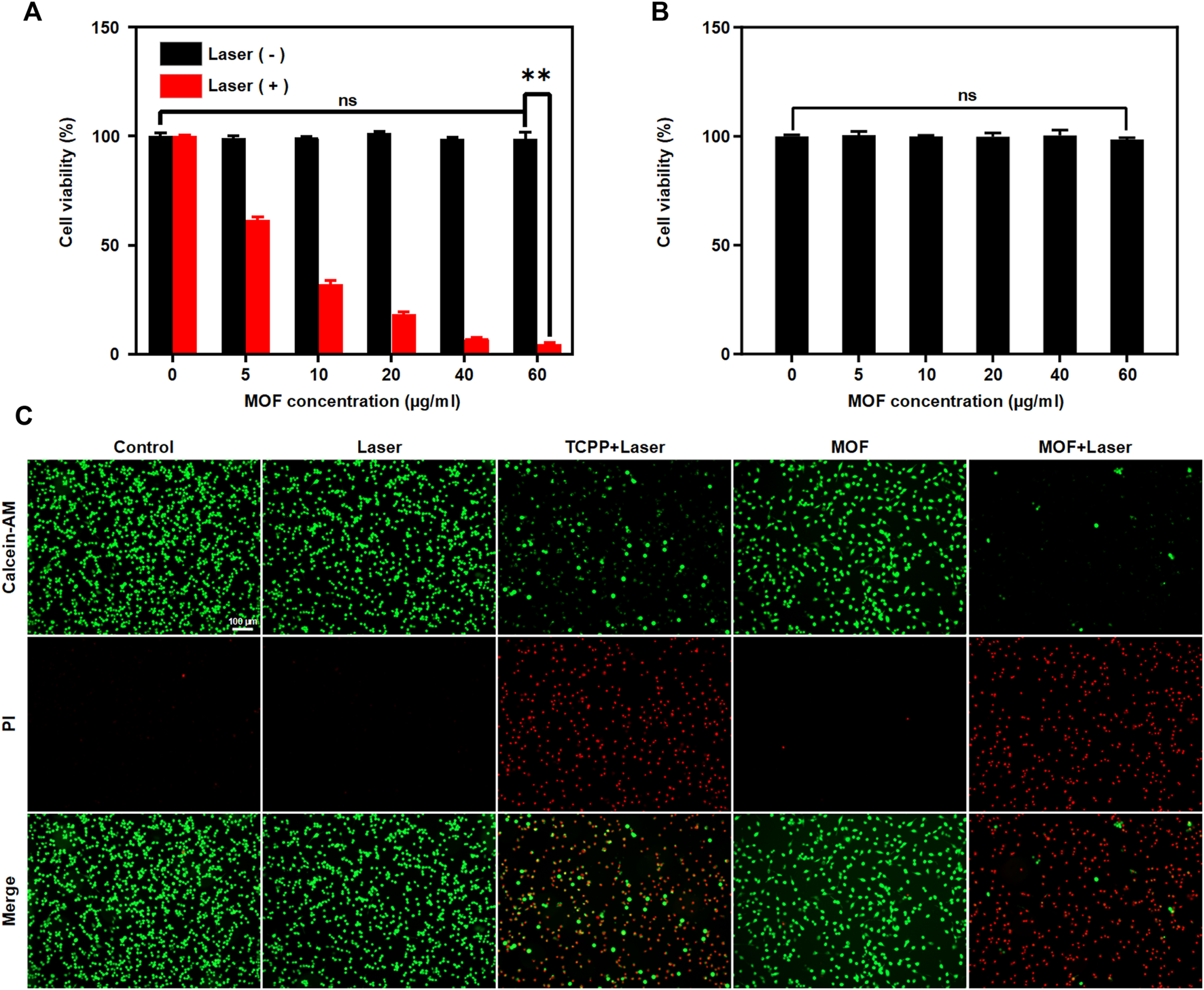 MOF mediated PDT in vitro. Cell viability of (A) CT26. WT cells and (B) BNL. CL2 cells treated with MOF with or without laser irradiation (660 nm, 50 mW cm−2, 5 min). (C) Detection of live/dead cells after various treatments. Live and dead cells were stained with calcein-AM (green) and PI (red), respectively. Scale bar: 100 μm. (**p < 0.01)