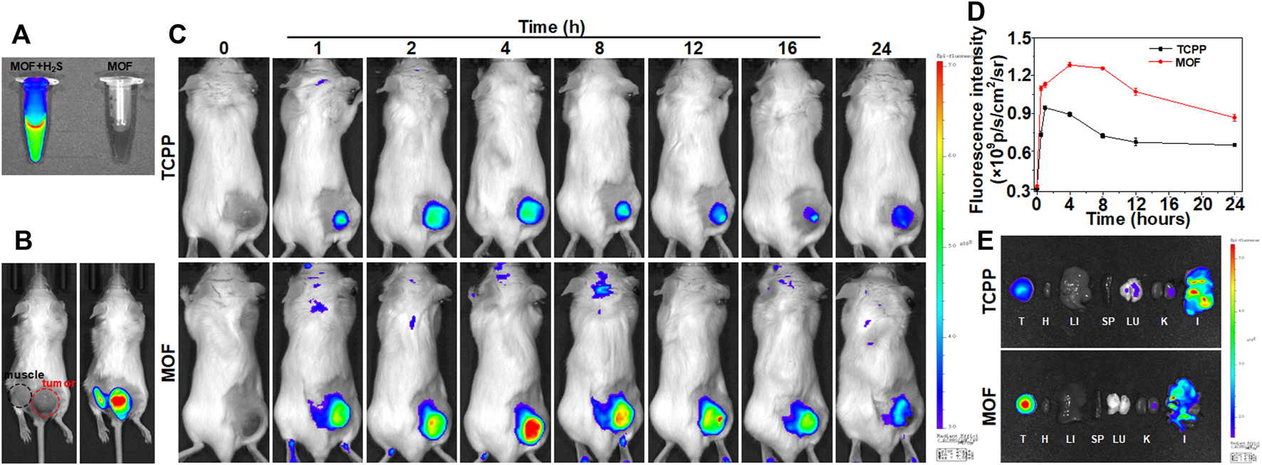 Targeted fluorescence imaging of MOF. (A) FL imaging of MOF and MOF with NaHS. (B) Fluorescence in tumor and muscle sites by intratumoral injection within 30 min. (C) Fluorescence imaging of mice over time by intravenous injection. (D) Relative fluorescence signal in tumor at different time points of tumor bearing mice after intravenous injection of MOF and TCPP in Figure 4C(E)Ex vivo fluorescence images of major organs and tumor at 4 h post-injection (λex = 675 nm, λem = 707 nm). (I: Intestine, H: Heart, LU: Lung, LI: Liver, K: Kidney, SP: Spleen, and T: Tumor).