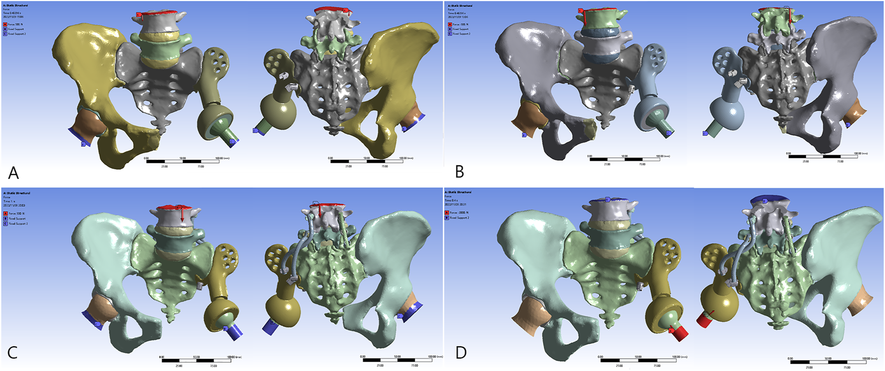 The validation model of the normal pelvis. (A) The bilateral proximal femurs were restrained, and the load was applied to the L4 vertebra. (B) The distribution of the von Mises force. (C) The transmission of loading stress from the trunk (blue arrows). (D) The distribution of the force in the pelvic ring.