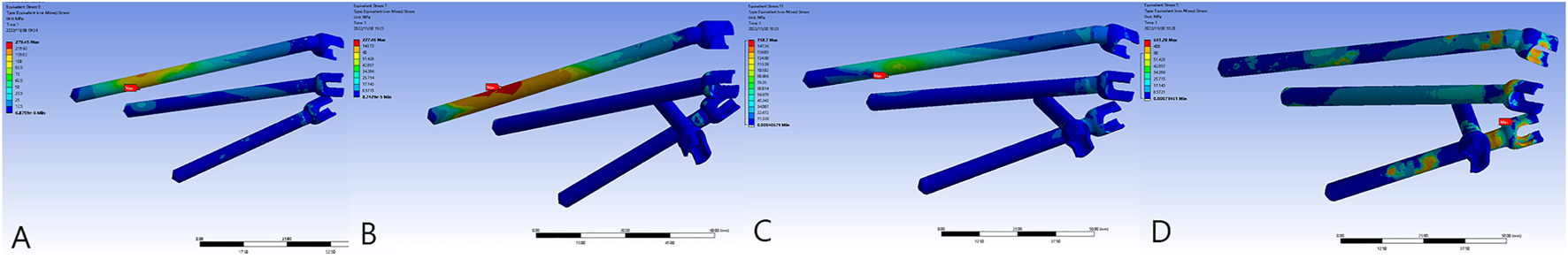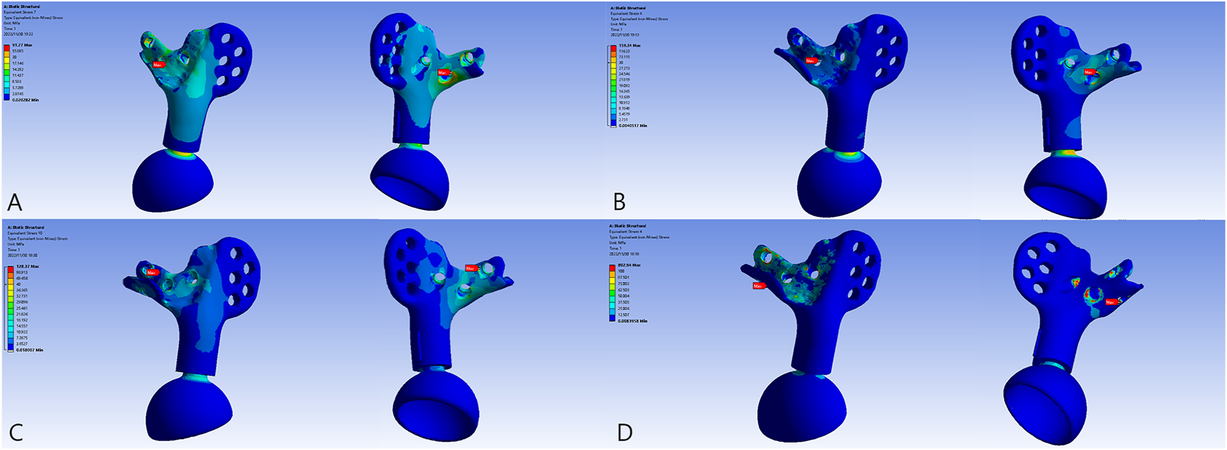 The von Mises force of the prosthesis and the force concentrated near the screw holes. (A) Model 1_B. (B) Model 2_B. (C) Model 3_B. (D) Model 3_E.