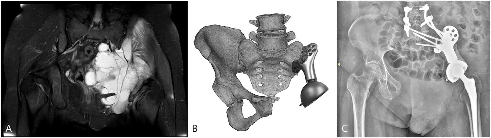 The patient (case 3) with the highest BMI was selected for FE analysis. (A) Preoperative magnetic resonance imaging (MRI) showed the involvement of the sacroiliac joint. (B) The surgery simulation that fitting the sacral tray onto the ventral sacrum. (C) The postoperative X-ray at the latest follow-up.