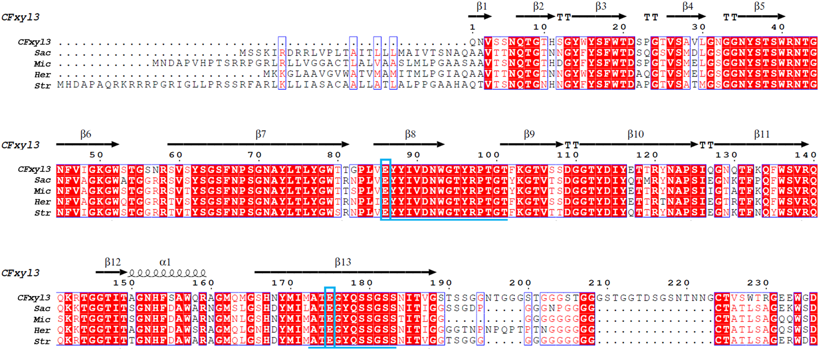 Primary structures multiple alignment between CFXyl3 and four typical xylanases from family 11. Abbreviations: CFXyl3 (WP_013115499.1, in this work); Str, Streptomyces (WP_093661817.1); Sac, Saccharothrix (NUT48201.1); Mic, Micromonospora (WP_168002960.1); and Her, Herbidospora cretacea (WP_051760875.1). The duplicate residues among these xylanases showed in red background. The two blue boxed letters mark the catalytic residues Glu86 (acid/base) and Glu175 (nucleophile), numbered by CFXyl3. The underlined amino acid sequence indicated two conserved motifs. The catalytic residues are indicated with blue boxes. One α-helix and 13 β-strands in CFXyl3 are represented as a black coil and black arrows, respectively.