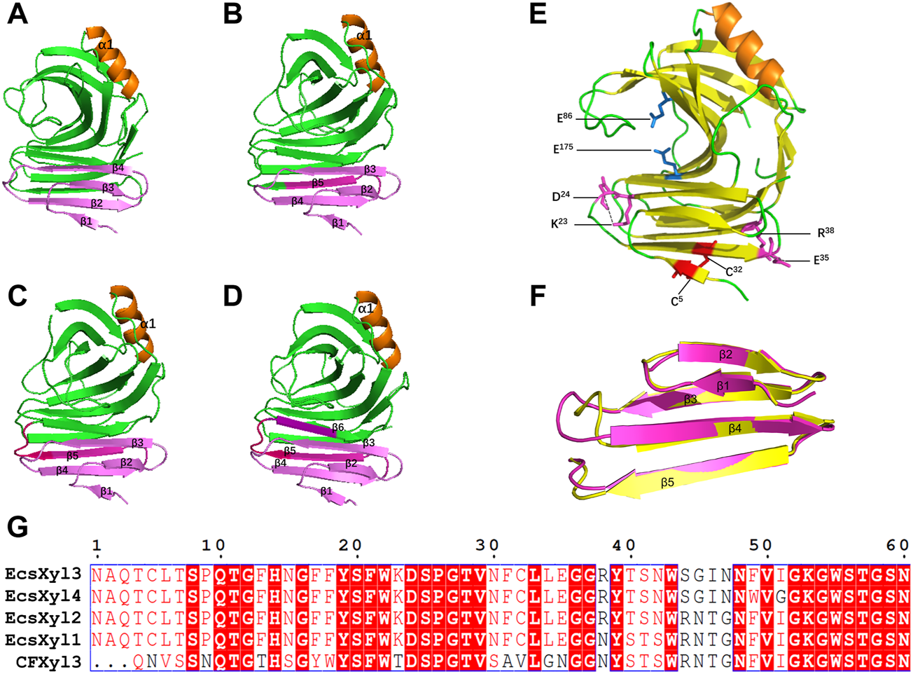 The 3D structure analysis of EcsXyl1 (A), EcsXyl2 (B), EcsXyl3 (C) and EcsXyl4 (D). The pink part and purple part are the amino acid position of the N-terminal substitution. (E): The catalytic residues (Glu86 and Glu175) exist in the central part of the active area. The disulfide bridge (Cys5–Cys32) and salt bridges (Lys23–Asp24 and Glu35–Arg38) were led into CFXyl3 arose from N-terminus substitution. (F): Stereoview of superimposed structure of the N-terminus substitution part of the CFxyl3 (yellow) and Ecxyl4 (pink). (G): Sequence alignment of the N-terminus substitution part of the CFXyl3 and EcsXyl1–EcsXyl4.