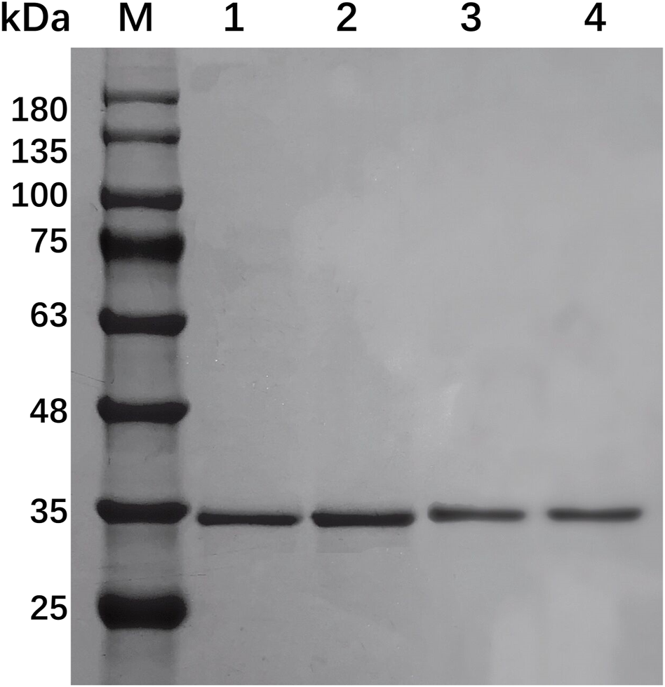 SDS-PAGE of EcsXyl1– EcsXyl4 purification steps. Lane M, molecular weight marker; Lane 1, purified EcsXyl1, Lane 2, purified EcsXyl2, Lane 3, purified EcsXyl3, Lane 4, purified EcsXyl4.