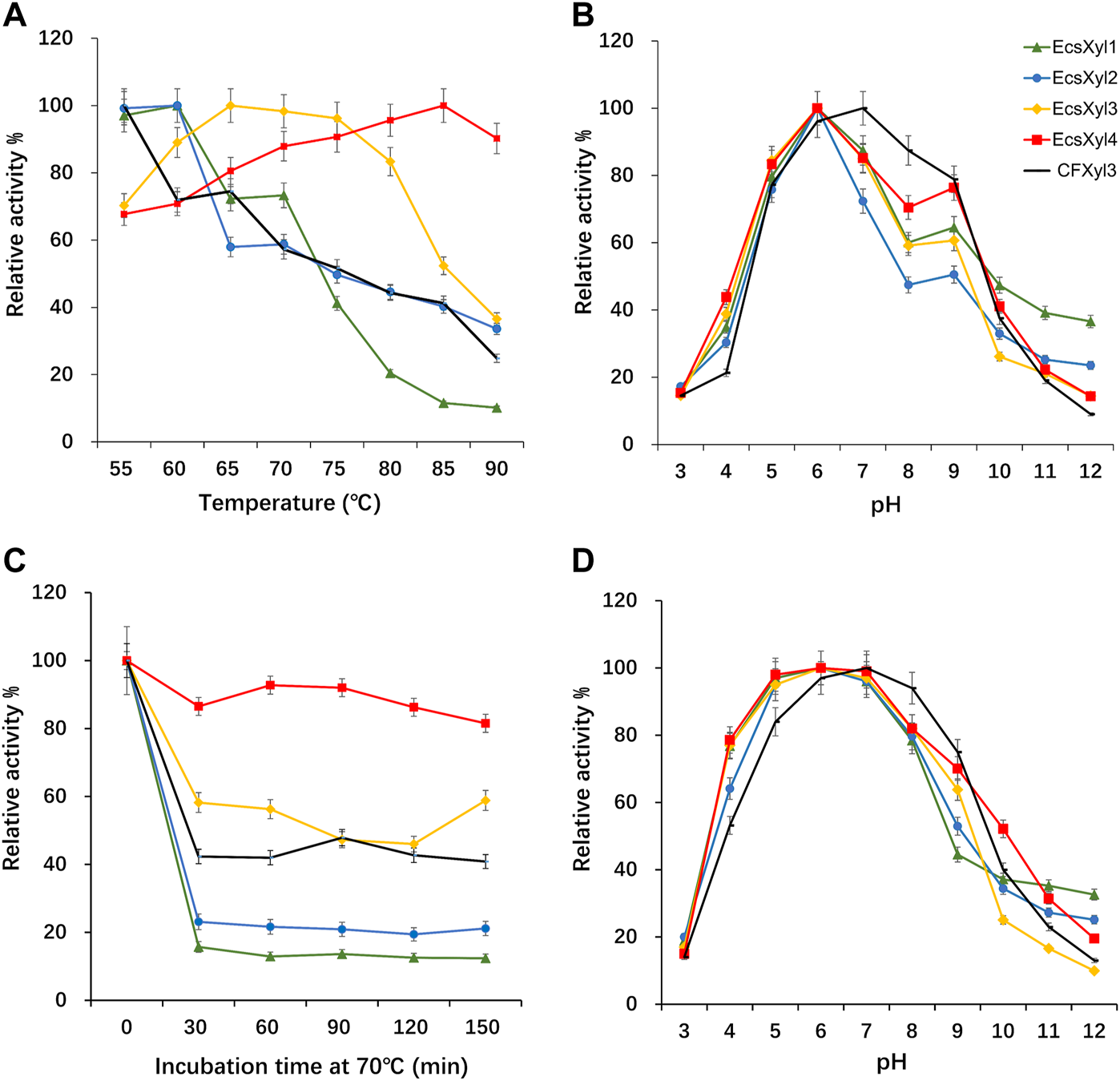 Influence of the temperature and pH on CFXyl3 and EcsXyl1–4 xylanases, thermal and pH stabilities. (A): Optimal temperature; (B): Optimal pH; (C): Thermal stability at 70°C; (D): pH stability.