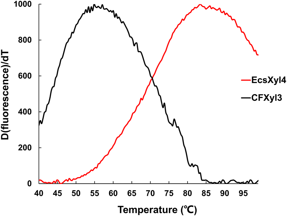Derivative melting curves of CFXyl3 (black) and EcsXyl4 (red). The emission intensity of the fluorescence dye was recorded from 40 to 99°C at an elevated rate of 1°C min−1.