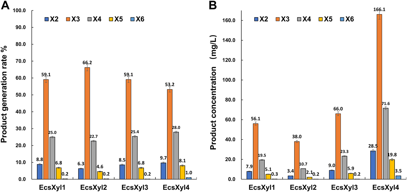 HPLC result analysis of the hydrolystaes broken down into beechwood xylan by EcsXyl1– EcsXyl4 at pH 9.0 and 55°C for 30 min. (A): Product generation rate; (B): Product concentration.