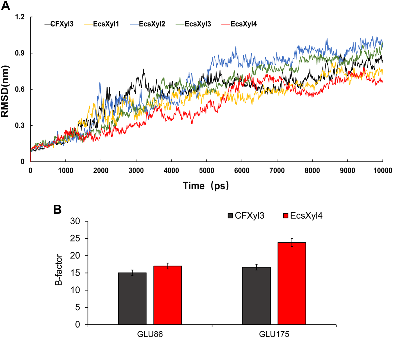 Curves of RMSD values of CFXyl3 and EcsXyl1-4 after MD simulations for 10Â ns (A). RMSF values of CFXyl3 and EcsXyl4 at two key catalytic sites (B).
