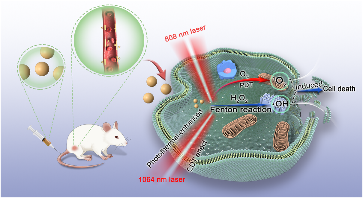 In this study, a bimodal imaging-guided CDT nanoagent (CMS@B@I) was designed, which achieved superior PDT and photothermal-enhanced CDT effects. CMS@B@I not only exhibited excellent Fenton activity, owing to its multivalent elements of Cu and Mn, but also produced sufficient ROS after exposure to 808 nm laser irradiation, amplifying cellular oxidative stress. Additionally, CMS@B@I possessed superior photothermal performance (PCE = 35.3%) under 1,064 nm laser irradiation, and was able to significantly enhance the catalytic activity of tumor therapy. Both in vitro and in vivo experimental results demonstrated that CMS@B@I not only performed bimodal imaging (NIR-II fluorescence and infrared thermal imaging) on tracing the therapeutic effect, but also remarkably inhibited tumor growth with negligible side effects. This study provides an innovative strategy to fabricate imaging-guided and photothermal-enhanced CDT nanoagents for tumor catalytic therapy, which highlights its promising clinical potential.
