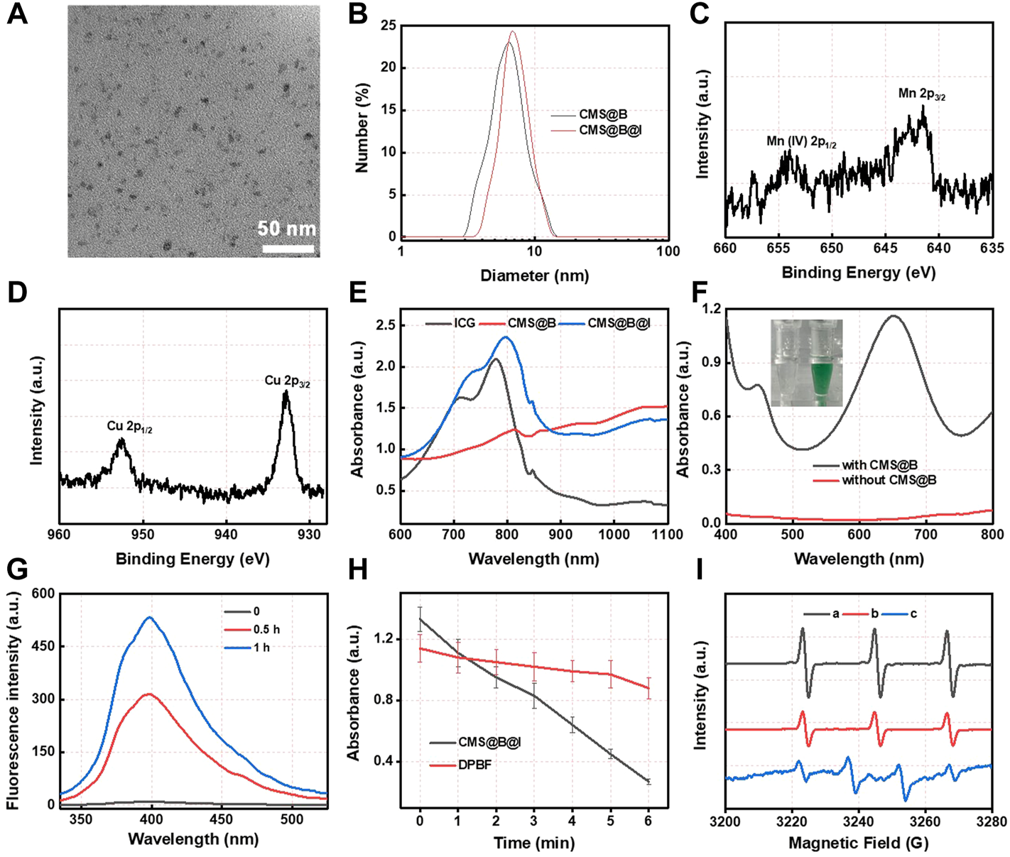 (A) TEM images of CMS@B@I. (B) DLS size distribution of various nanoparticles. (C) High resolution Mn 2p XPS spectrum. (D) High resolution Cu 2p XPS spectrum. (E) UV-vis spectra of different nanoparticles and ICG. (F) UV-vis spectra of TMB (1 mM) incubated with H2O2 (1 mM) in the presence of CMS@B. (G) UV-vis spectra of Ti(SO4)2 incubated with CMS@B@I-pretreated H2O2. (H) The detection of superoxide radical by using DPBF kit. (I) The ESR spectrum detect the •OH and 1O2 by using BMPO and TEMP as a trapping agent, respectively. (A) TEMP + CMS@B@I + laser, (B) TEMP + ICG + laser, and (C) BMPO + CMS@B@I + H2O2. *p < 0.05, **p < 0.01, ***p < 0.001.