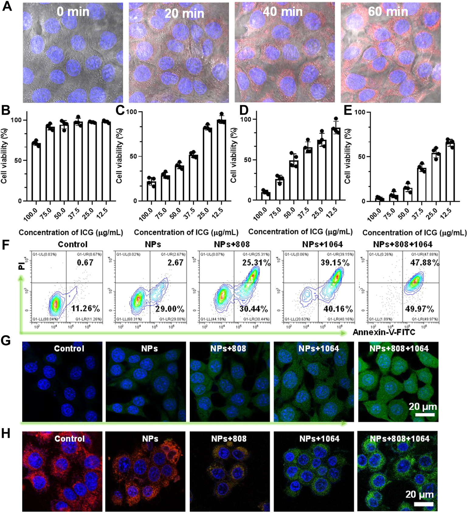 (A)The cellular uptake behavior of CMS@B@I. (B) Viability of 4T1 cells treated with different concentrations of CMS@B@I. (C) Viability of 4T1 cells treated with different concentrations of CMS@B@I plus 808 nm laser. (D) Viability of 4T1 cells treated with different concentrations of CMS@B@I plus 1,064 nm laser. (E) Viability of 4T1 cells treated with different concentrations of CMS@B@I plus 808 nm and 1,064 nm laser. (F) Flow cytometry analyzed the apoptosis rate after different treatments. (G) DCFH-DA stained 4T1 cells treated with CMS@B@I under 808 nm or 1,064 nm laser irradiation for 5 min (H) CLSM images analyzed mitochondrial depolarization by using JC-1 kit. *p < 0.05, **p < 0.01, ***p < 0.001.