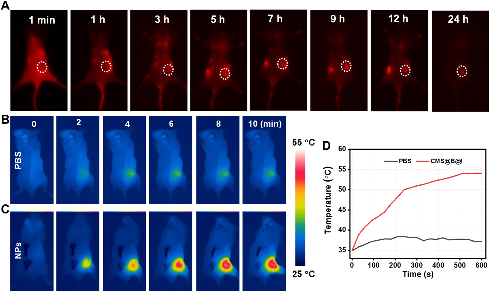 (A) The NIR-II fluorescence images of tumor in 4T1 tumor-bearing mice at different time points. (B) THE infrared thermal images of PBS and (C) CMS@B@I of tumor in 4T1 tumor-bearing mice at different time points. (D) The corresponding temperature change curves of the tumor in 4T1 tumor-bearing mice.