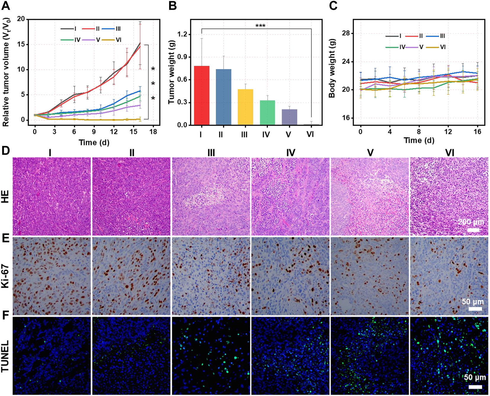(A) The tumor growth curves of mice treated with different formulations. I (PBS), II (PBS plus L), III (CMS@B@I), IV (CMS@B@I plus 808 nm laser), V (CMS@B@I plus 1,064 nm laser), and VI (CMS@B@I plus 808 nm and 1,064 nm lasers). (B) The average weights of tumor dissected from mice. (C) The fluctuation of body weight after different treatments. (D) H&E staining, (E) Ki-67 and (F) TUNEL of tumor slides from different group. *p < 0.05, **p < 0.01, ***p < 0.001.