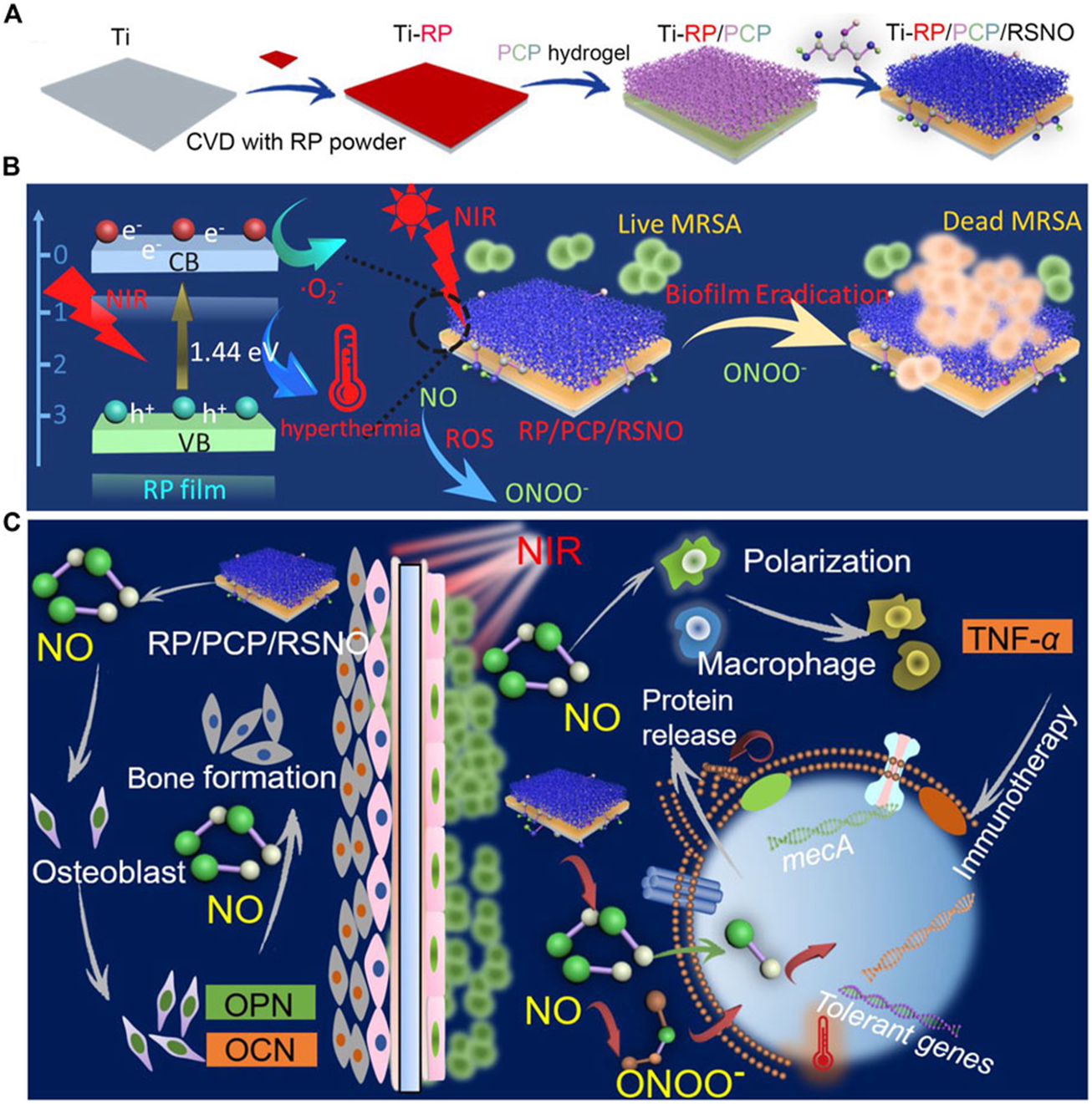 (A) Ti-RP/PCP/RSNO hydrogel coating system preparation process schematic diagram. (B) A diagram showing how a biofilm can be eliminated using NIR. (C) Diagrammatic representation of the processes encouraging bone growth and clearing MRSA biofilms. Ti is for titanium; CVD is for chemical vapor deposition; RP stands for red phosphorus; PCP is for polyvinyl alcohol hydrogel; NIR is for near infrared; MRSA is for methicillin-resistant Staphylococcus aureus; and NO is for nitric oxide (Li et al., 2020)., Copyright 2020, American Chemical Society.