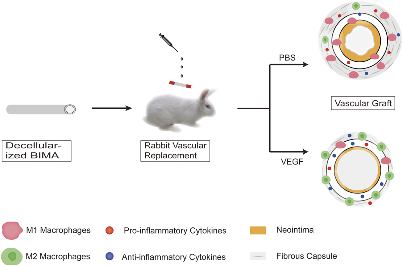 In this study, we successfully produced decellularized bovine internal mammary arteries (BIMAs) which have a desired length (15–20 cm) and diameter (3–5 mm) (Liu et al., 2022) and assessed the influence of our decellularization approach on their biochemical composition and biomechanical properties. In RAW264.7 cell cultures, we demonstrated that VEGF induces macrophage polarization towards the M2 phenotype. Furthermore, immunofluorescence and histological analyses of subcutaneous and abdominal aortic graft implants from New Zealand rabbits were used to quantify macrophage phenotype, local cytokine expression, and fibrous capsule and neointimal thickness (Figure 1).