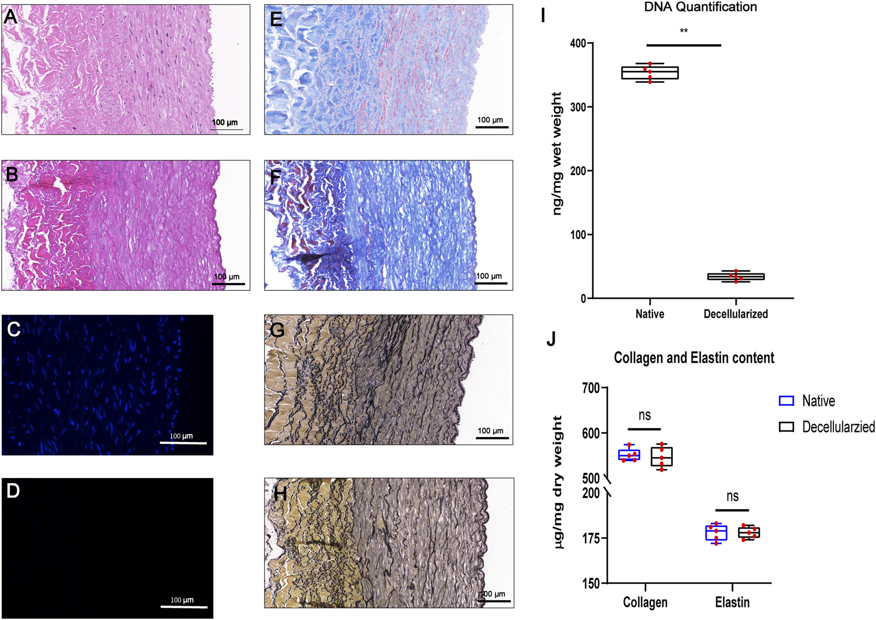 Successful decellularization of bovine internal mammary artery (BIMA) while preserving extracellular matrix components. Characteristics of the bovine internal mammary artery (BIMA) before (A,C,E, and G) and after (B,D,F, and H) decellularization. H&E staining (A,B), DAPI staining (C,D) Masson’s trichrome staining (E,F) and elastic Van-Gieson staining (G,H). DNA quantification of native and decellularized BIMA (I). Content of collagen and elastin was insignificant between native and decellularized BIMA (J). *p < 0.05. **p < 0.01. ns represents no significant difference.