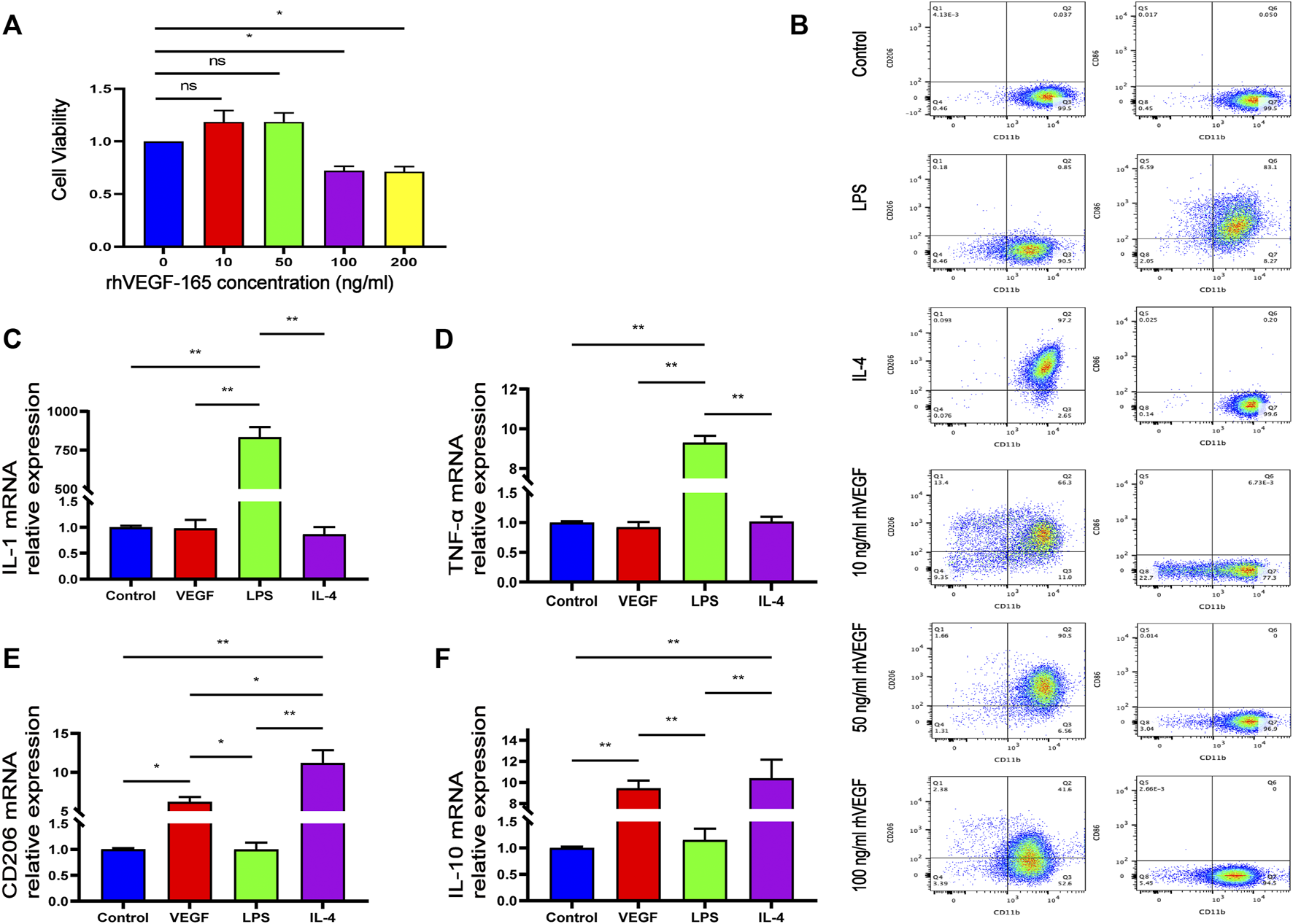 Viability of RAW264.7 macrophages after 24 h of incubation with different concentrations of rhVEGF-165 (A). The proportion of M1 to M2 macrophages in RAW264.7 cells in each group (B). The expression levels of M1 or M2 macrophage markers in RAW264.7 cells in each group (C,D,E and F). *p < 0.05. **p < 0.01. ns represents no significant difference.