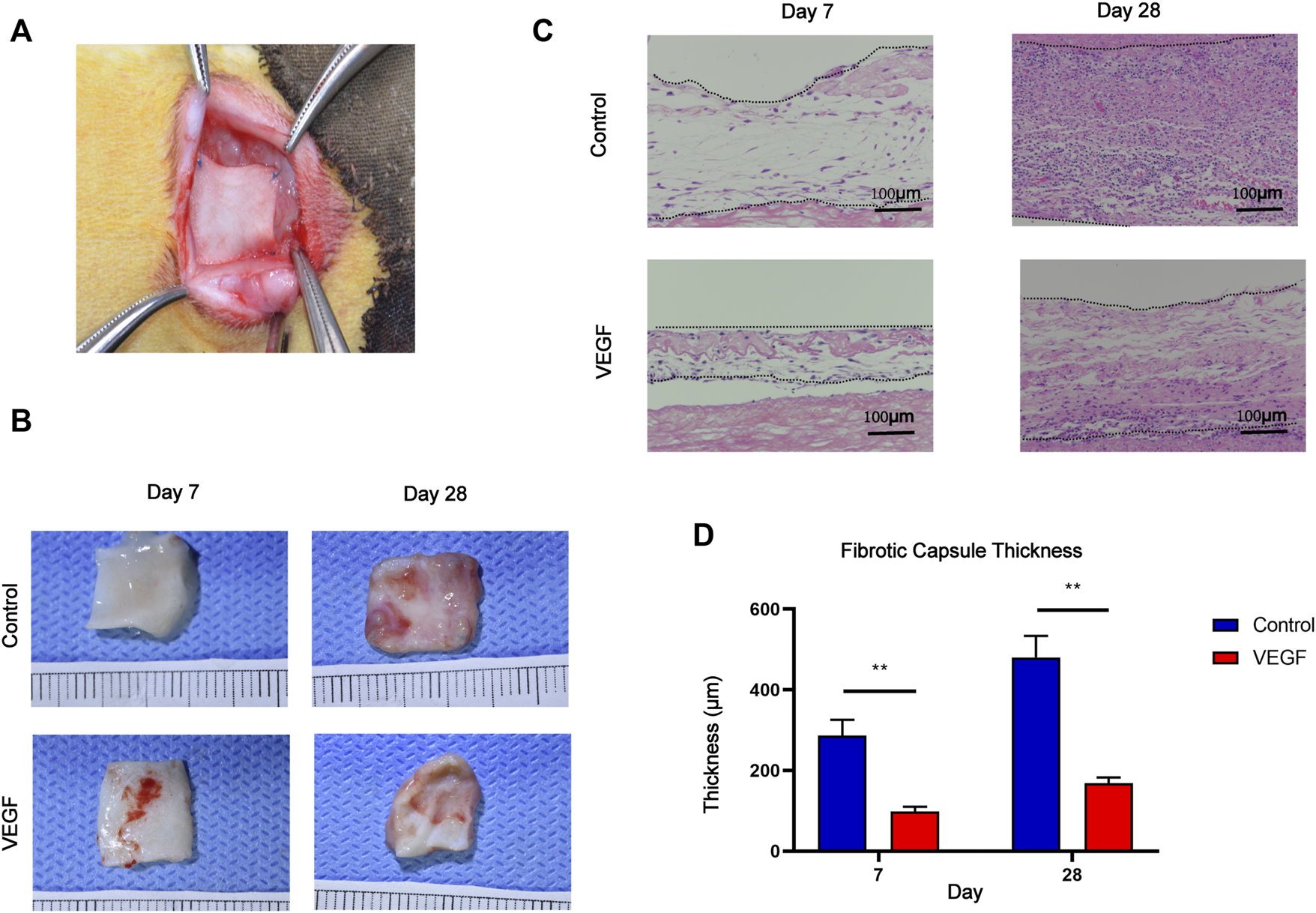 Macroscopic images of the rabbit subcutaneous implantation model (A). Gross images of subcutaneous implants at days 7 and 28 in each group (B). HE staining of subcutaneous implants at days 7 and 28 in each group. Between the two dashed lines depicts the fibrous capsule of subcutaneous implants (C). Measurement of fibrous capsule thickness (D). *p < 0.05. **p < 0.01. ns represents no significant difference.