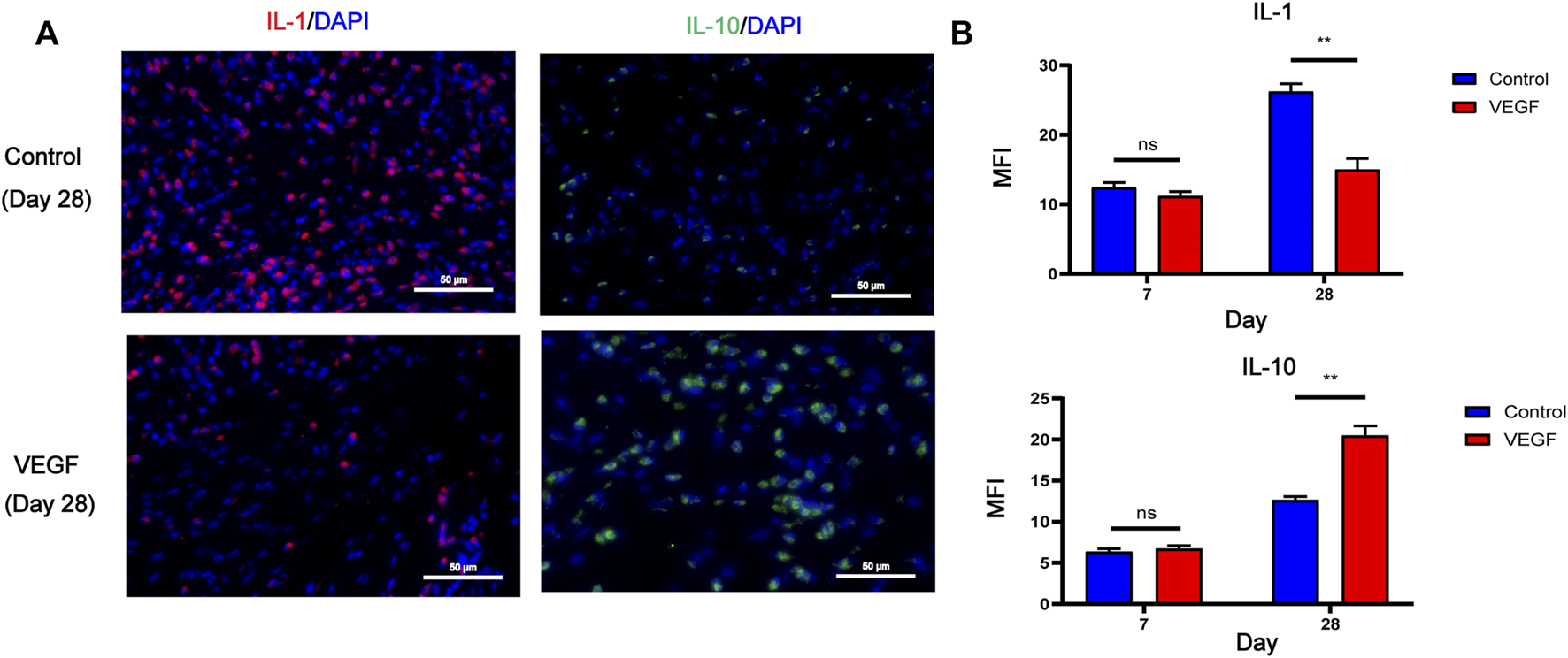 Compared with the control group, the density of total macrophages in the VEGF group was significantly increased. The increased density of CD206-positive cells (Day 7, 83.79 ± 6.64 count/mm2 vs. 50.50 ± 5.13 count/mm2, p < 0.01; Day 28, 338.80 ± 23.42 count/mm2 vs. 115.20 ± 6.70 count/mm2, p < 0.01; Figures 9, 11) and the increased M2/M1 ratio (Day 7, 1.18 ± 0.13 vs. 0.73 ± 0.08, p < 0.05; Day 28, 2.15 ± 0.26 vs. 0.57 ± 0.06, p < 0.01; Figures 9, 11) in the VEGF group compared to the control group showed a similar macrophage polarization effect. Further examination revealed an increase in anti-inflammatory IL-10 and a decrease in pro-inflammatory IL-1 expression in the VEGF group compared to the control group at day 28 (Figure 10). These results further confirmed immunomodulatory role of VEGF.